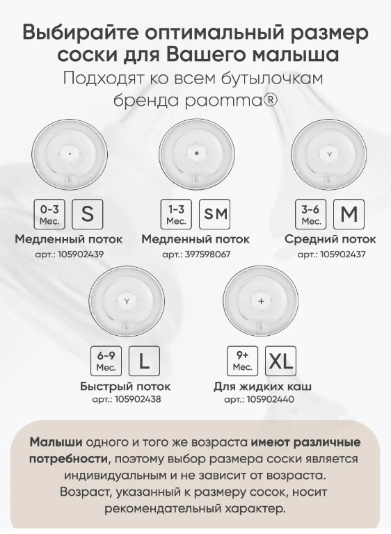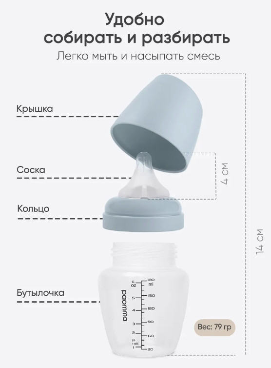 💳 Оплатить за товар можно при получении 🇰🇿 Есть бесплатная доставка по Казахстану от 1 дня 🎁 Копите бонусы с каждой покупки Пластиковая бутылочка для кормления Paomma — идеальный подарок для новорожденного. Она предназначена для малышей с первых дней жизни и оснащена герметичной крышкой и ярко-прорисованной шкалой, начинающейся с 30 мл, с допустимой погрешностью до 5-10 мл. Бутылочка для новорожденных детей имеет широкое горлышко диаметром 5 см, что облегчает её мытье как в посудомоечной машине, так и вручную. Дизайн продуман до мелочей, чтобы малышу и маме было удобно держать её в руках. Высота бутылочки составляет 13,2 см, а ширина — 7,2 см, что позволяет легко помещать её в стерилизатор. Соска изготовлена из 100% пищевого силикона, который является гипоаллергенным и прочным материалом. Антиколиковая система с воздушным клапаном улучшает циркуляцию воздуха, предотвращая боли в животе, икоту и дискомфорт. Соска с комбинированной текстурой Mom Effect гладкая и бархатистая, а её форма имитирует материнскую грудь, обеспечивая надежный захват. Внутри бутылочки расположены ребра жесткости, предотвращающие слипание материала при высыхании смеси. Бутылочка также подходит для воды и может использоваться для соков с 3 месяцев. Соски для бутылки доступны отдельно в четырех размерах: S (0-3 месяцев), M (3-6 месяцев), L (1,2 мм, 6-9 месяцев), XL (крестообразная, 9+ месяцев). Рекомендации по уходу включают стерилизацию и кипячение в течение 5 минут. Бутылочка не содержит BPA и фталатов и совместима с большинством моделей стерилизаторов, подогревателей, термосов и термосумок. |