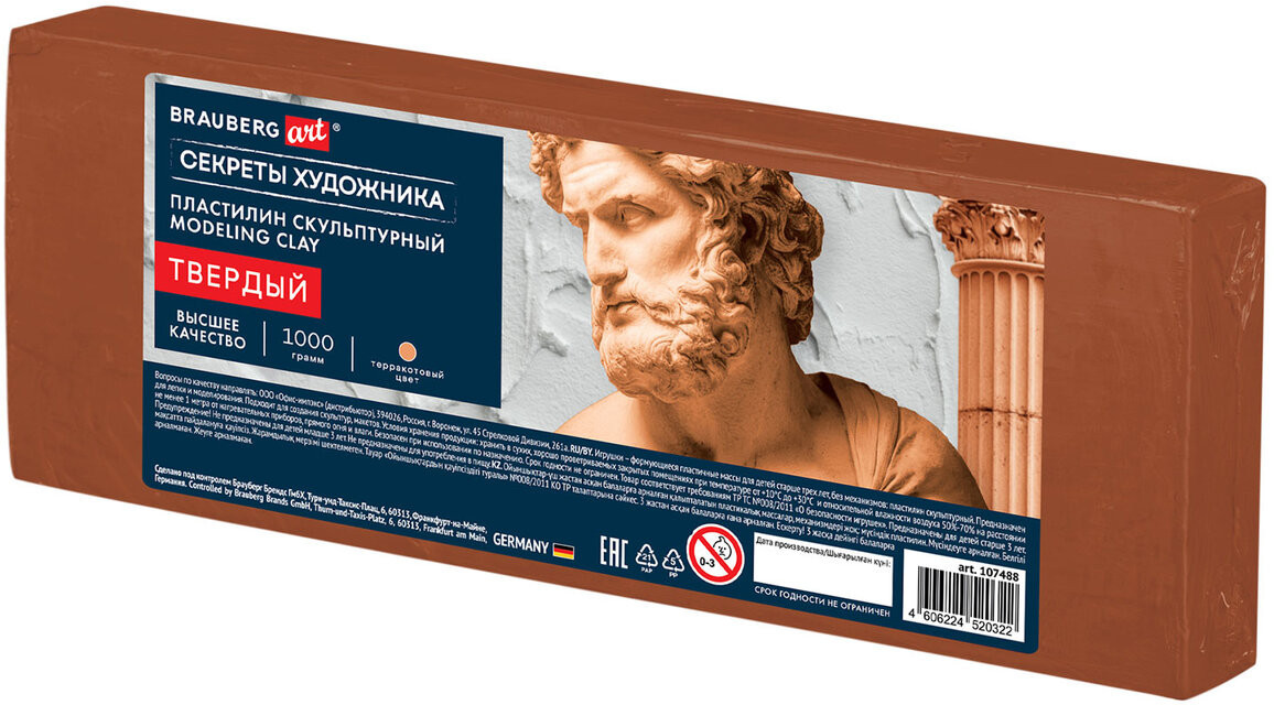 Скульптурный пластилин Brauberg Art «Секреты художника» предназначен для моделирования и создания скульптур, макетов, поделок. Идеально подходит не только для студентов, но и для всех, кто хочет научиться моделированию. Скульптурный пластилин пользуется широким спросом среди профессионалов и любителей. Его часто используют студенты факультетов скульптуры или ученики художественных школ на учебных занятиях. Отлично держит форму и устойчив к перепадам температуры. Не оставляет пятен, не липнет к рукам. Твердый скульптурный пластилин необходимо дольше разогревать, фигуры из него лучше сохраняют форму. Пластилин весом 1 кг упакован в термоусадочную пленку.