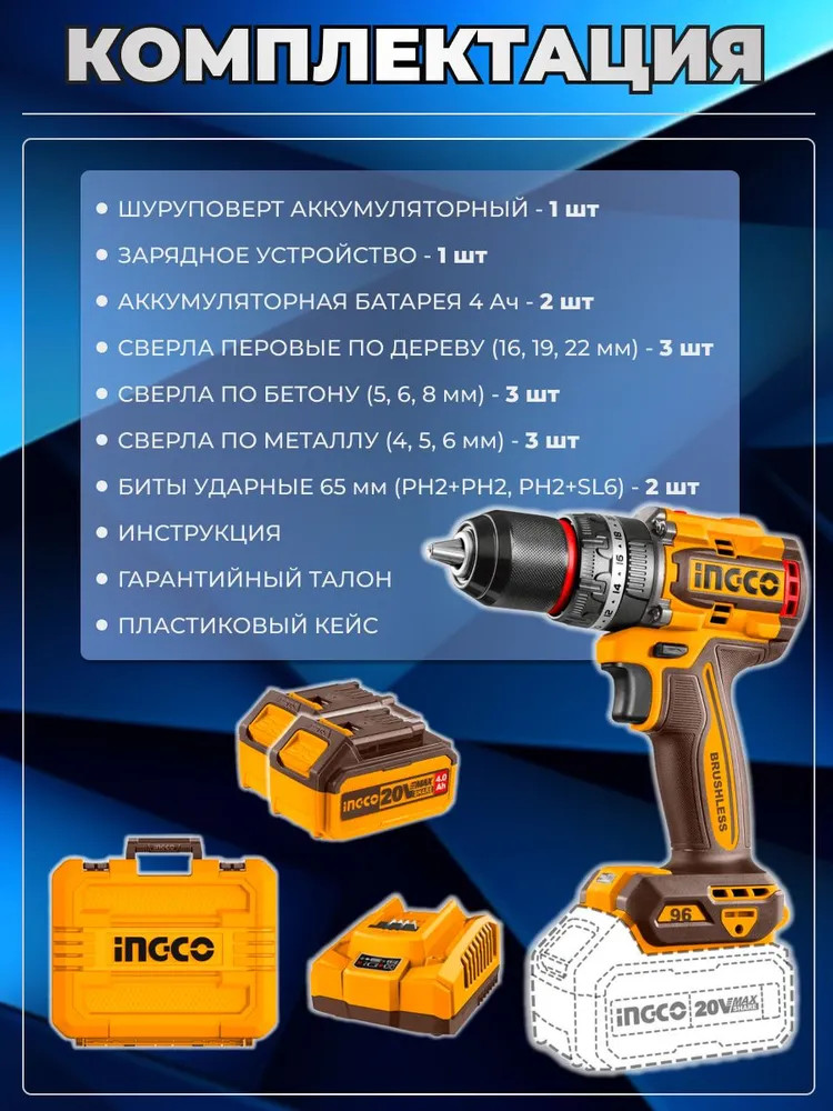 | INGCO Аккумуляторный бесщёточный ударный шуруповерт INGCO+998 (бонусов)