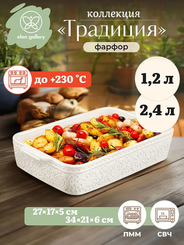Форма для запекания Elan Gallery «Традиция» объемом 1,2 литра выполнена из фарфора. Размер 27.2×17×5.2 см. Внутренний размер 22.8×15.8×4.8 см. Размер изделия без ручек 23.8×17×5.2 см, размер дна 22,9×15.8 см. Форма для запекания Elan Gallery «Традиция» объемом 2,4 литра выполнена из фарфора. Размер 34.7×21.7×6 см. Внутренний размер 29.6×20.4×5.5 см. Размер без ручек 30.5×21.7×6 см, размер дна 28.5×20 см. Размер изделия без ручек 23.8×17×5.2 см, размер дна 22.9×15.8 см. Фарфоровая ёмкость молочного белого цвета подходит для выпекания в духовке и подачи готового блюда на стол в той же форме. В ней получится чудесная лазанья или выпечка. «Традиция» — это коллекция посуды для запекания, вдохновлённая уютом домашней кухни. Мягкие очертания, нежные оттенки и рельефные узоры навевают атмосферу безмятежности и пробуждают светлые воспоминания. Изделия созданы для любимых блюд по семейным рецептам, которые собирают близких за одним столом. Глубокая тарелка прямоугольной формы удобна для приготовления различных кулинарных шедевров: мясных и овощных запеканок, а также пирога и заливного. Блюдо станет универсальным предметом на кухне: можно использовать для приготовления и сервировки еды. Испеките нежный десерт из творога, а также приготовьте чизкейк, кекс или бисквит. Любители кондитерских изделий оценят удобство при создании творожной выпечки или тирамису. Используйте как контейнер для хранения остатков еды, прикрыв фольгой, либо в роли сервировочного лотка для подачи закусок, хлеба и горячих блюд из мяса и рыбы. Можно использовать как шубницу — для приготовления классической селёдки под шубой или подачи салата.