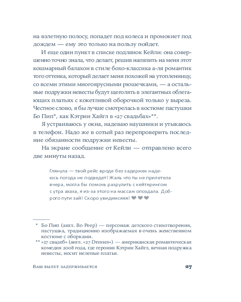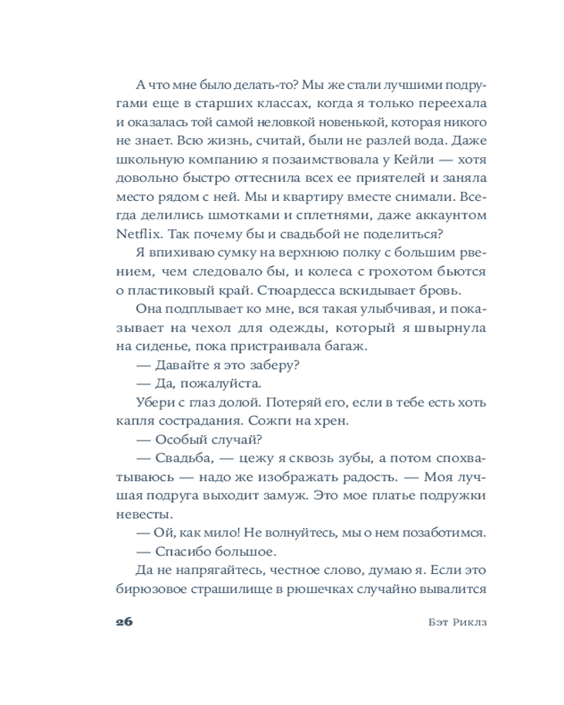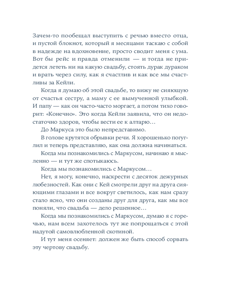 💳 Оплатить за товар можно при получении 🇰🇿 Есть бесплатная доставка по Казахстану от 1 дня 🎁 Копите бонусы с каждой покупки Роскошная свадьба в солнечной Барселоне — мечта или катастрофа? Три гостя уверены: церемонию нужно остановить любой ценой. Джемма — подружка невесты, но летит на праздник не для того, чтобы разбрасывать конфетти. После долгих лет на вторых ролях она наконец-то готова постоять за себя. Франческа когда-то провела прекрасную ночь с женихом. У нее остался последний шанс сказать ему о своих чувствах. Леон уверен, что его сестра совершает самую большую ошибку в жизни, — вся их семья ненавидит ее избранника. Из-за ночного шторма Джемма, Франческа и Леон застревают в парижском аэропорту. В ожидании рейса они начинают сомневаться в собственных решениях и чувствах — ведь в любви, как и в путешествии, одна случайная встреча может переписать все планы. |