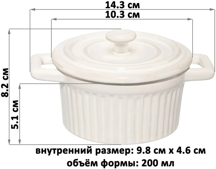 Форма для запекания с крышкой и ручками Elan Gallery «Традиция» объемом 200 мл выполнена из фарфора. Можно использовать как рамекин, жюльенницу, а также для красивой сервировки. Размер 14.3×10.3×8.2 см. Внутренний размер 9.8×4.6 см. Высота без крышки 5.1 см, диаметр крышки 11 см, диаметр дна 9.3 см. Маленькая фарфоровая ёмкость с крышечкой подходит для выпекания в духовке и подачи готового блюда на стол в той же форме. «Традиция» — это коллекция посуды для запекания, вдохновлённая уютом домашней кухни. Мягкие очертания, нежные оттенки и рельефные узоры навевают атмосферу безмятежности и пробуждают светлые воспоминания. Изделия созданы для любимых блюд по семейным рецептам, которые собирают близких за одним столом. Круглую жаропрочную формочку молочного белого цвета можно использовать для приготовления жюльена, порционных блюд из мяса и рыбы, картофельных и творожных запеканок. Порадуйте ваших близких выпечкой или кондитерскими изделиями: крем-брюле, кексами, пирожными или любыми десертами из творога. Приготовьте ароматное суфле или капкейк, украсив свежими ягодами!