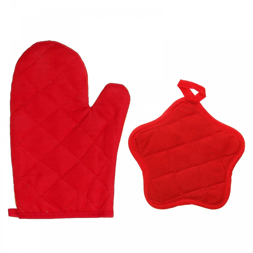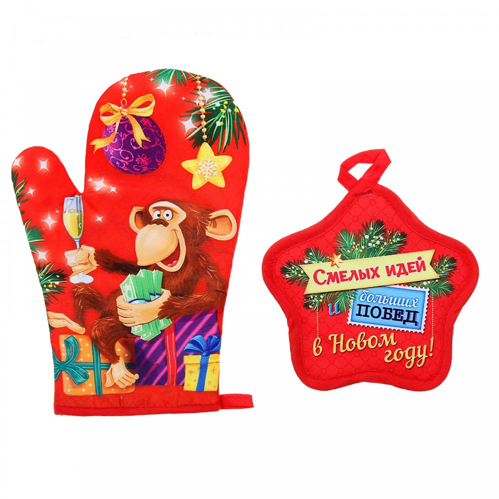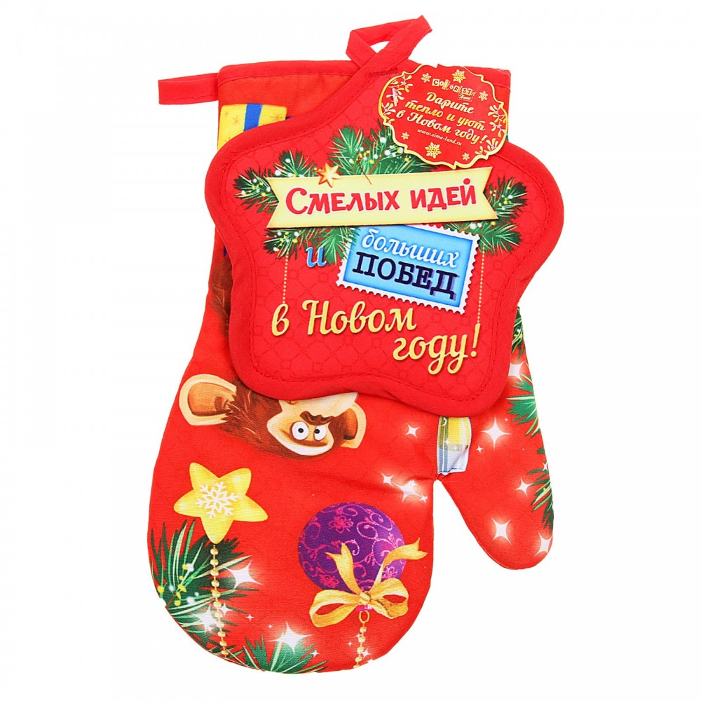 Когда пришло время достать из духовки аппетитно зажаренное мясо или передвинуть на плите горячие сковородки, мы непременно вспоминаем о прихватке. Данный кухонный набор создан для того, чтобы находиться всегда под рукой и помогать каждой хозяйке на кухне. Плотный материал, из которого изготовлены изделия, хорошо защитит руки от ожогов и какого-либо дискомфорта. А нарядный дизайн создаст атмосферу праздника и сделает настроение новогодним.