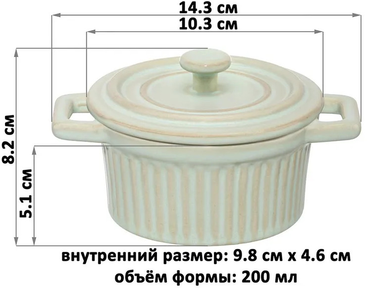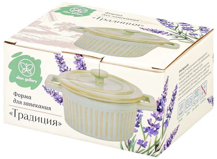 Форма для запекания с крышкой и ручками Elan Gallery «Традиция» объемом 200 мл выполнена из фарфора. Можно использовать как рамекин, жюльенницу, а также для красивой сервировки. Размер 14.3×10.3×8.2 см. Внутренний размер 9.8×4.6 см. Высота без крышки 5.1 см, диаметр крышки 11 см, диаметр дна 9.3 см. Маленькая фарфоровая ёмкость с крышечкой подходит для выпекания в духовке и подачи готового блюда на стол в той же форме. «Традиция» — это коллекция посуды для запекания, вдохновлённая уютом домашней кухни. Мягкие очертания, нежные оттенки и рельефные узоры навевают атмосферу безмятежности и пробуждают светлые воспоминания. Изделия созданы для любимых блюд по семейным рецептам, которые собирают близких за одним столом. Круглую жаропрочную формочку молочного белого цвета можно использовать для приготовления жюльена, порционных блюд из мяса и рыбы, картофельных и творожных запеканок. Порадуйте ваших близких выпечкой или кондитерскими изделиями: крем-брюле, кексами, пирожными или любыми десертами из творога. Приготовьте ароматное суфле или капкейк, украсив свежими ягодами!