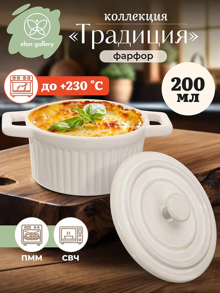 Форма для запекания с крышкой и ручками Elan Gallery «Традиция» объемом 200 мл выполнена из фарфора. Можно использовать как рамекин, жюльенницу, а также для красивой сервировки. Размер 14.3×10.3×8.2 см. Внутренний размер 9.8×4.6 см. Высота без крышки 5.1 см, диаметр крышки 11 см, диаметр дна 9.3 см. Маленькая фарфоровая ёмкость с крышечкой подходит для выпекания в духовке и подачи готового блюда на стол в той же форме. «Традиция» — это коллекция посуды для запекания, вдохновлённая уютом домашней кухни. Мягкие очертания, нежные оттенки и рельефные узоры навевают атмосферу безмятежности и пробуждают светлые воспоминания. Изделия созданы для любимых блюд по семейным рецептам, которые собирают близких за одним столом. Круглую жаропрочную формочку молочного белого цвета можно использовать для приготовления жюльена, порционных блюд из мяса и рыбы, картофельных и творожных запеканок. Порадуйте ваших близких выпечкой или кондитерскими изделиями: крем-брюле, кексами, пирожными или любыми десертами из творога. Приготовьте ароматное суфле или капкейк, украсив свежими ягодами!