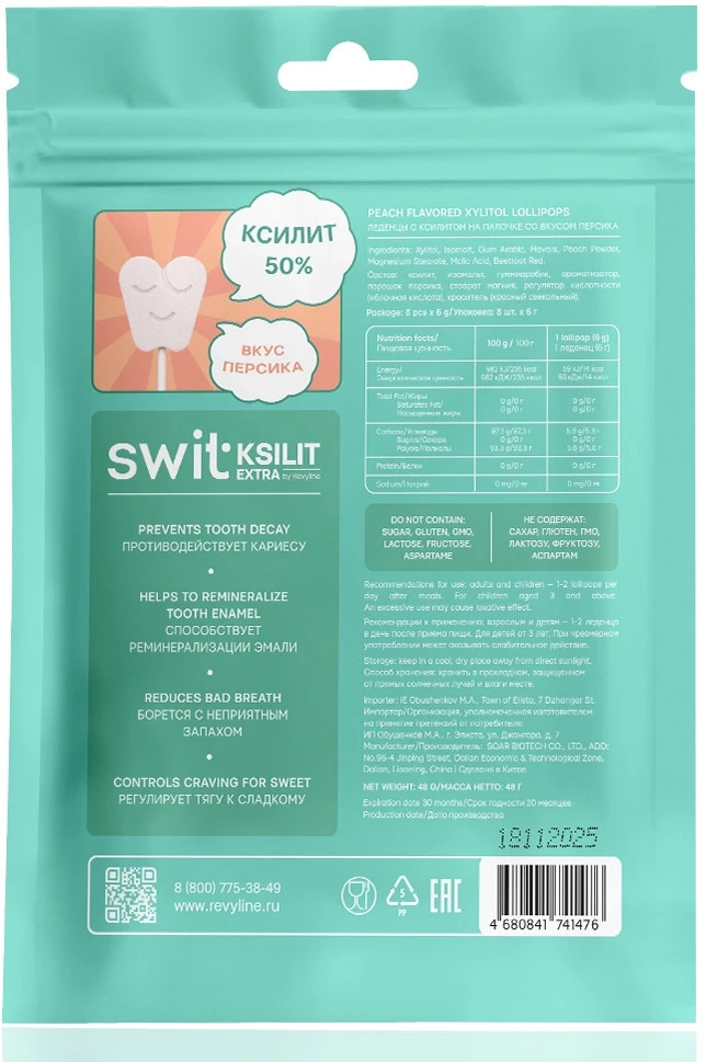 Леденцы на палочке Swit Ksilit extra — это сладкое удовольствие без вреда для зубов. Натуральный сахарозаменитель ксилит подавляет рост бактерий, снижая риск развития кариеса, способствует укреплению эмали, снижению кислотности в полости рта, стимуляции слюноотделения.