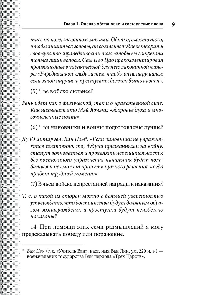 Ещё не дочитала, но книга уже оставила неизгладимый след в моем сердце. Каждая страница несет глубокий смысл и осознание. Читается тяжело из-за обилия китайской терминологии ( ну, лично для меня), приходится часто возвращаться и перечитывать, но меня это нисколько не напрягает. Наоборот, после перелистывания на пару страниц назад, приходит новое понимание глубины фраз, понятий и смысла . Очень понравилась книга, описанные тактики применимы во всех сферах бизнеса, политики и т.п.