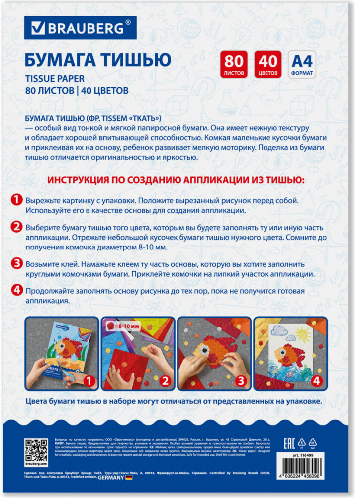 💳 Оплатить за товар можно при получении 🇰🇿 Есть бесплатная доставка по Казахстану от 1 дня 🎁 Копите бонусы с каждой покупки Данный набор бумаги тишью предназначена для детского творчества. Может использоваться детьми от 3 лет для развития моторики и воображения. Набор бумаги состоит из 80 листов, представленных в 40 цветах формата А4, и имеет плотность 17 г/м2. Бумага упакована в красочную картонную папку. Ваш ребенок сможет в полной мере окунуться с вами в мир фантазий, создавая свои первые поделки и аппликации. Набор так же можно использовать для оформления подарков, декорирования, создания красивых цветочных композиций, украшения интерьеров, скрапбукинга. |