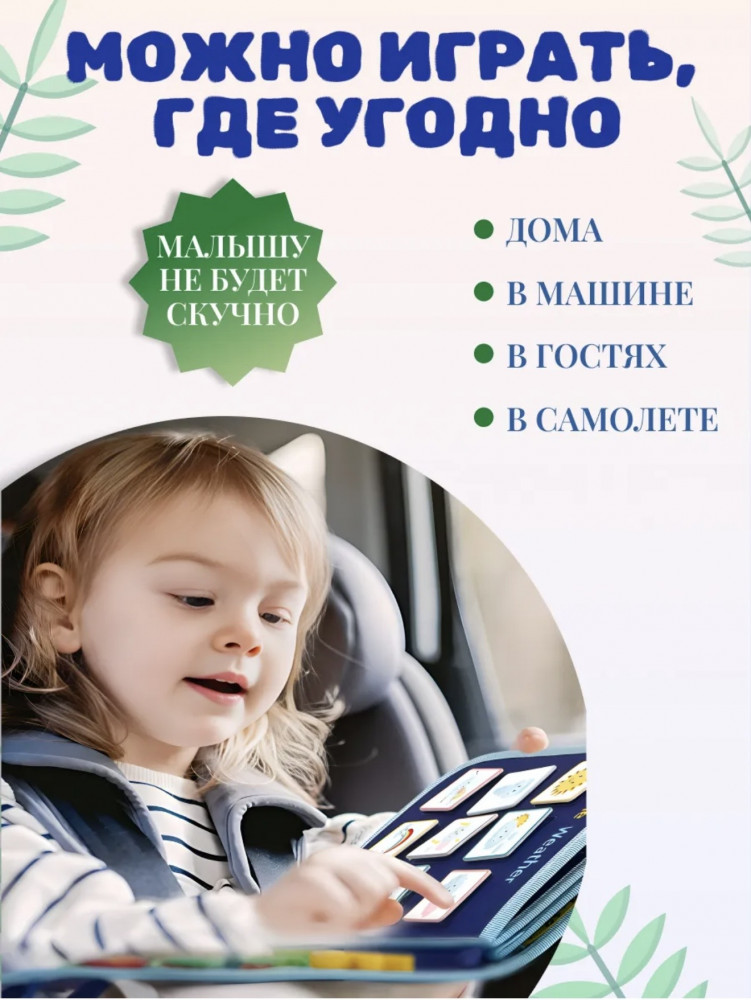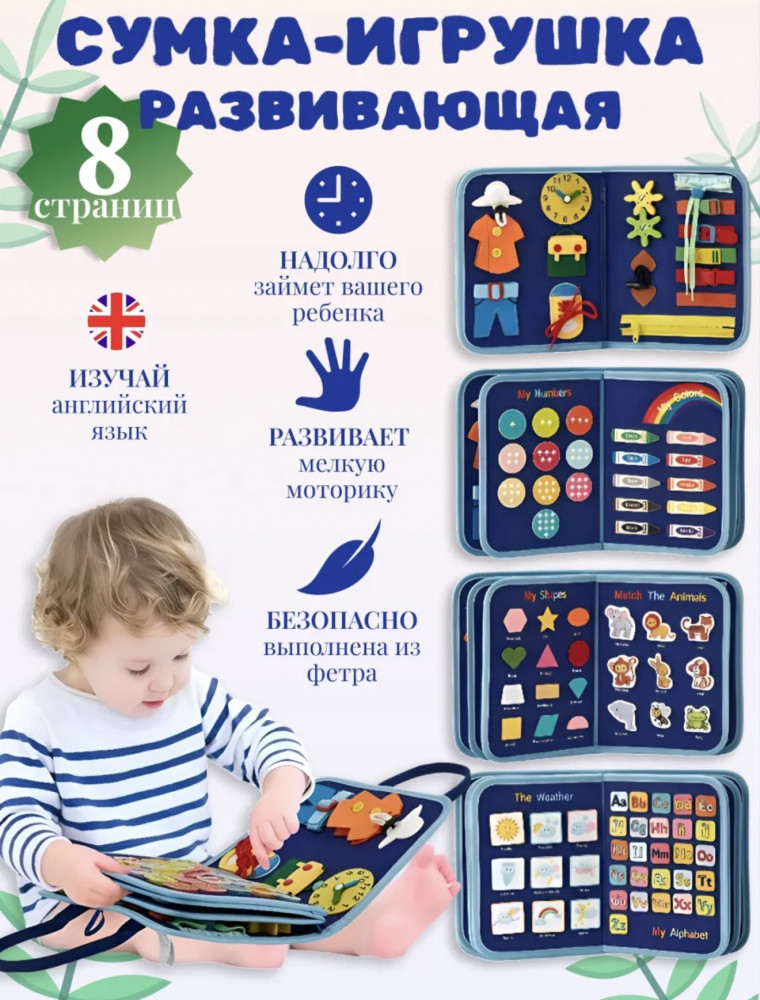 💳 Оплатить за товар можно при получении 🇰🇿 Есть бесплатная доставка по Казахстану от 1 дня 🎁 Копите бонусы с каждой покупки Мягкий бизиборд в форме детской сумочки — отличный способ компактно развить мелкую моторику, мышление и логическое восприятие ребёнка. Тактильная игрушка Монтессори станет прекрасным инструментом для стимулирования детского творчества и внимания во время путешествий. Этот развивающий аксессуар подходит для деток от 2 лет. Шуршащая книжка-фетр учит малышей первым жизненным навыкам и служит удобным спутником на прогулках и поездках. Игрушечный набор изготовлен из качественных материалов, абсолютно безопасных для вашего чада. Это идеальный подарок ребёнку на первый день рождения или другой праздник. |