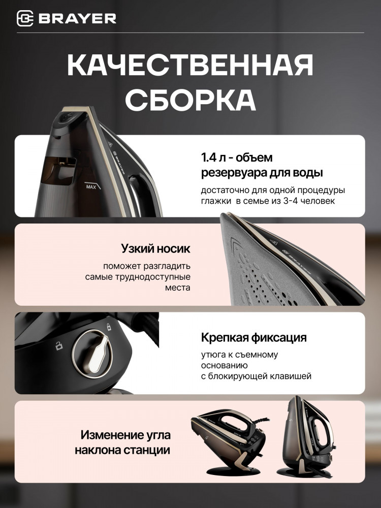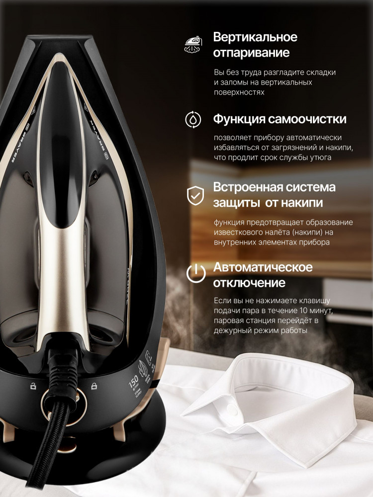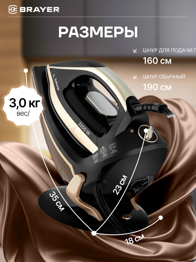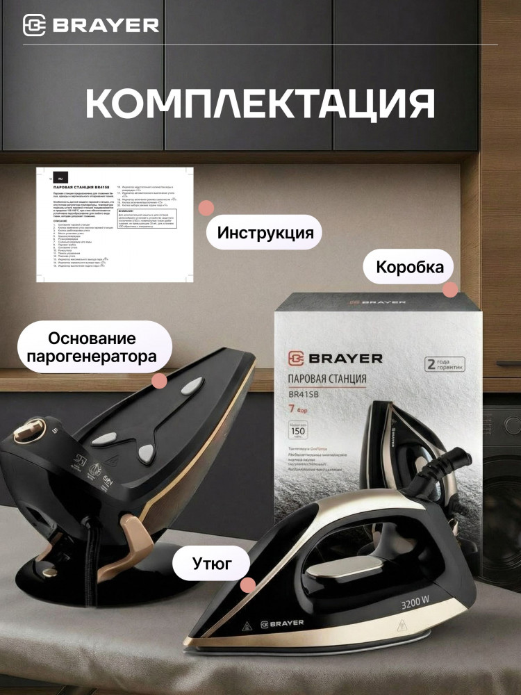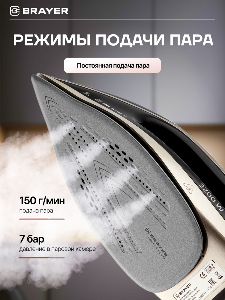 Утюг с отпаривателем оснащен керамической подошвой, которая не только равномерно распределяет тепло, но и обеспечивает легкое скольжение по различным материалам. Благодаря технологии One Temp, вы можете без труда справляться с разными видами тканей — просто выбирайте режим и наслаждайтесь безупречными результатами. Вертальный отпариватель дополнительно расширяет функциональность устройства. Теперь вы можете быстро обновить свитера, платья и даже шторы — без необходимости раскладывать их на гладильной доске. Это особенно актуально для одежды, которую нельзя гладить обычным утюгом. Пользуйтесь современным подходом к глажке и придайте своим вещам аккуратный вид с парогенератором BRAYER BR4158. Надежный и удобный в использовании, он станет вашим незаменимым помощником в домашнем хозяйстве.