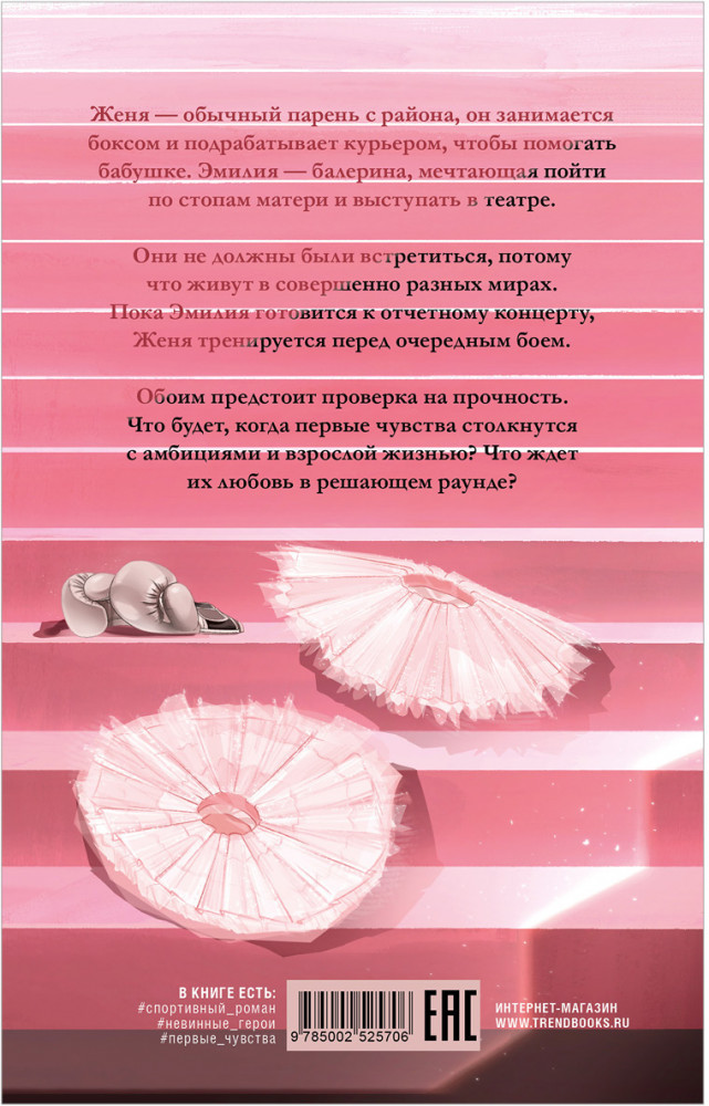 💳 Оплатить за товар можно при получении 🇰🇿 Есть бесплатная доставка по Казахстану от 1 дня 🎁 Копите бонусы с каждой покупки Серия: Спортивные романы Trendbooks «Решающий раунд» — трепетный роман о первой любви между балериной и боксером. Столкновение двух миров, моральный выбор, ответственность и взросление в новинке Trendbooks с нежной обложкой Анастасии Акируш. Женя — обычный парень с района, он занимается боксом и подрабатывает курьером, чтобы помогать бабушке. Эмилия — балерина, мечтающая пойти по стопам матери и выступать в театре. Они не должны были встретиться, потому что живут в совершенно разных мирах. Пока Эмилия готовится к отчетному концерту, Женя тренируется перед очередным боем. Обоим предстоит проверка на прочность. Что будет, когда первые чувства столкнутся с амбициями и взрослой жизнью? Что ждет их любовь в решающем раунде? |