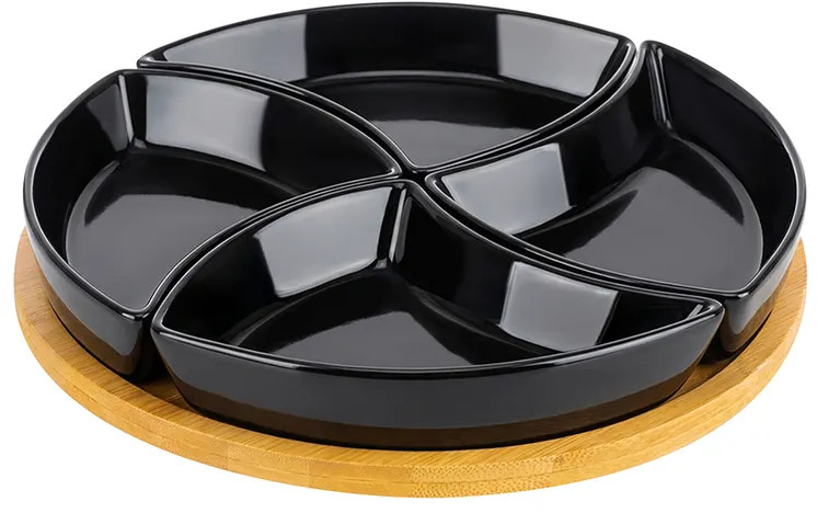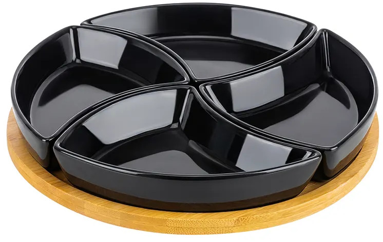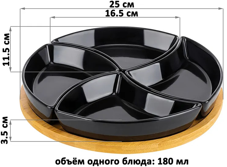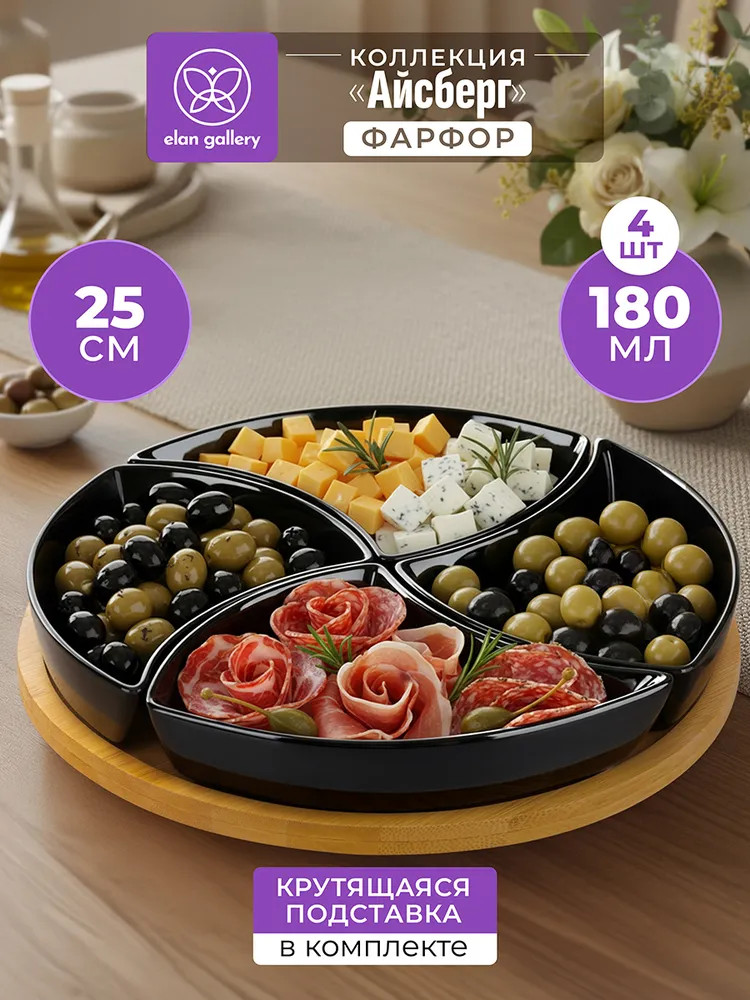 Менажница от бренда Elan Gallery «Айсберг» подойдёт для красивой подачи закусок, сыра к вину и различных сладостей к чаю. Выполнена из фарфора, имеет в комплекте крутящуюся бамбуковую подставку. Представляет собой 4 фигурные формы, которые снимаются с подставки и могут быть использованы по отдельности. Общий размер комплекта — 25×25×5 см. Объём каждой ёмкости — 180 мл, размер каждой ёмкости — 16.5×11.5×3.5 см. Заполните секционную тарелочку разными угощениями: орехами и оливками, сухофруктами, ягодами или конфетами. Благодаря вращающейся подставке можно легко взять закуску из нужного отделения. Каждая секция станет сервировочной тарелкой для варенья, мёда или соуса. Подойдёт для подачи небольших кусочков фруктов и овощей. В некоторые отсеки можно положить сырные ломтики, мясную нарезку и орешки, а другие использовать как соусники к этим угощениям. Такая сервировка украсит праздничный стол и сэкономит место на нём.