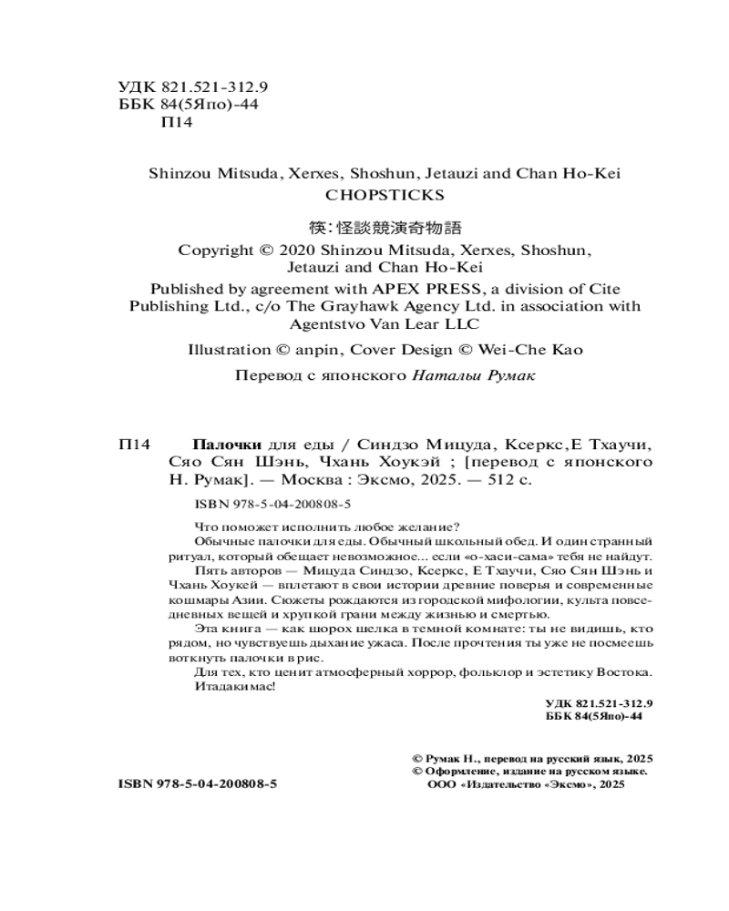 💳 Оплатить за товар можно при получении 🇰🇿 Есть бесплатная доставка по Казахстану от 1 дня 🎁 Копите бонусы с каждой покупки Серия: Young Adult. Азиатский хоррор Когда-то эти палочки были просто бамбуком. Пока кто-то не попросил у них исполнить желание. Теперь они слушают. И если «о-хаси-сама» тебя найдут — поздно бежать. Пять авторов из Японии, Китая и Гонконга создают хоррор, который пробирает до мурашек. Здесь нет чудовищ из фильмов — только люди и их собственные тени. Здесь страх — не в крови, а в осознании. Каждая история — как новая ступень в хороводе ужасов, где ритуалы, суеверия и детские воспоминания становятся ловушками. |