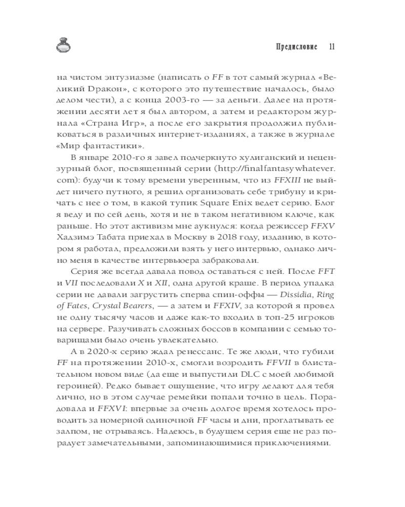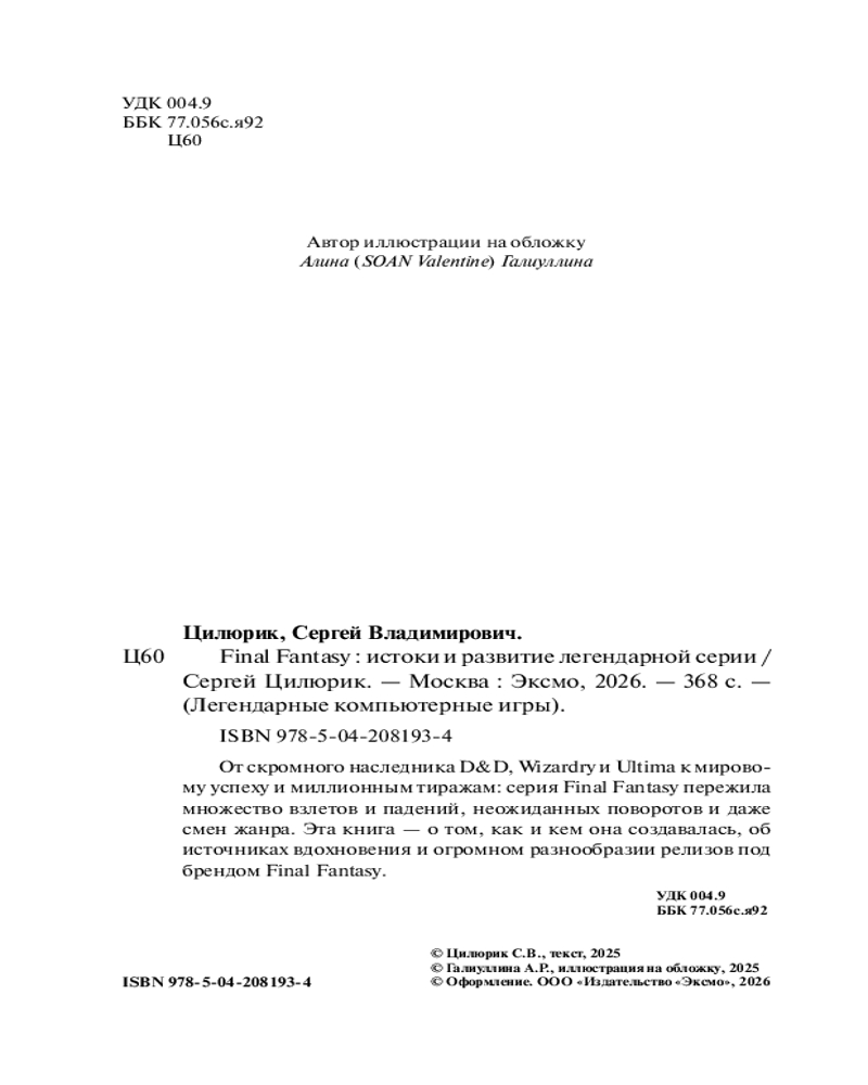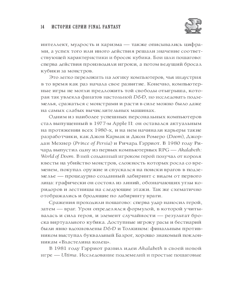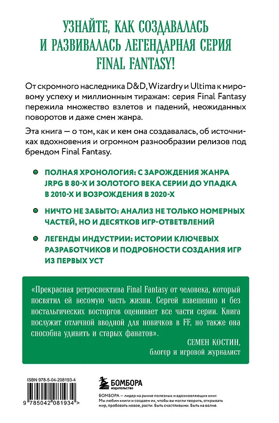 💳 Оплатить за товар можно при получении 🇰🇿 Есть бесплатная доставка по Казахстану от 1 дня 🎁 Копите бонусы с каждой покупки Серия: Легендарные компьютерные игры От скромного наследника D&D, Wizardry и Ultima к мировому успеху и миллионным тиражам: серия Final Fantasy пережила множество взлетов и падений, неожиданных поворотов и даже смен жанра. Эта книга — о том, как и кем она создавалась, об источниках вдохновения и огромном разнообразии релизов под брендом Final Fantasy. Полная хронология: с зарождения жанра JRPG в 80-х и «золотого века» серии до упадка в 2010-х и возрождения в 2020-х. Ничто не забыто: анализ не только номерных частей, но и десятков ответвлений серии. История в лицах: истории ключевых разработчиков и подробности создания игр из первых уст. |