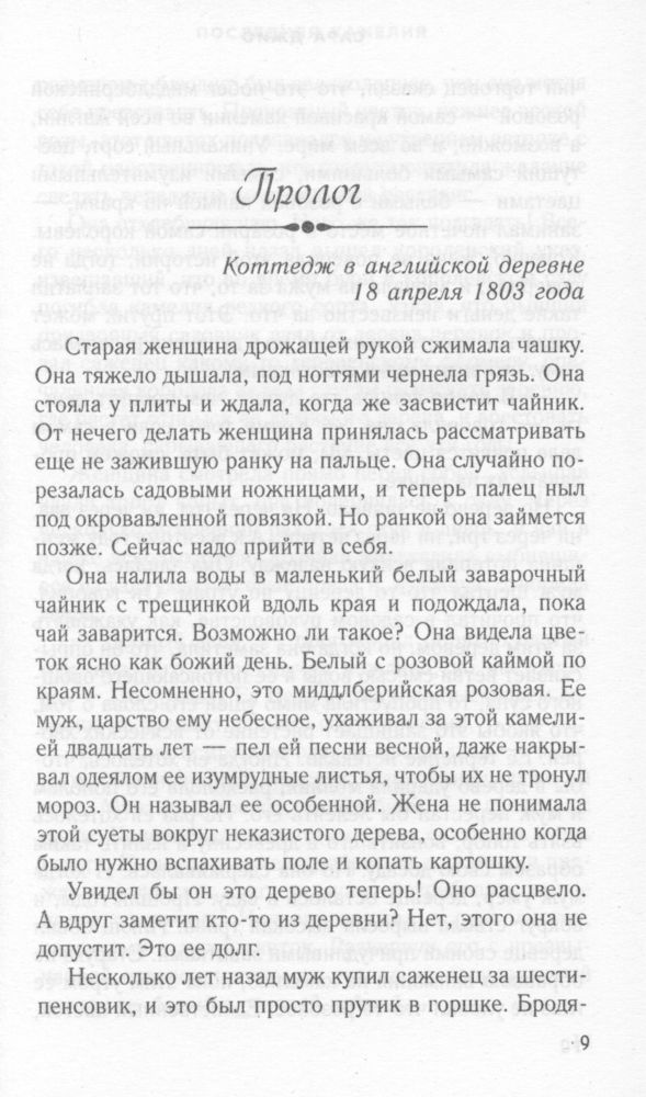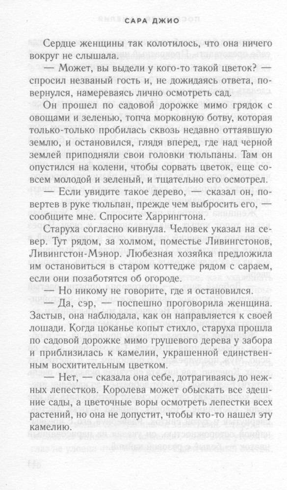 По оформлению книга такая же красивая, как и три предыдущие. По содержанию тоже не уступает. Мне очень нравится стиль изложения романов Сары Джио. Детектив, закрученный вокруг камелии. Только не совсем понятно, что же случилось с Флорой? Если осталась жива, почему не вернулась домой?
