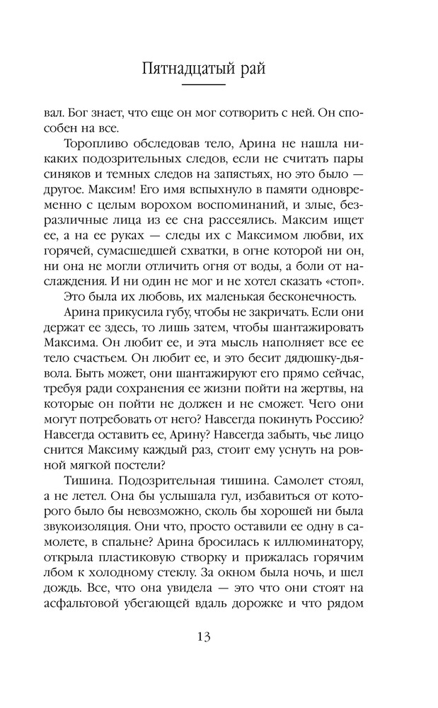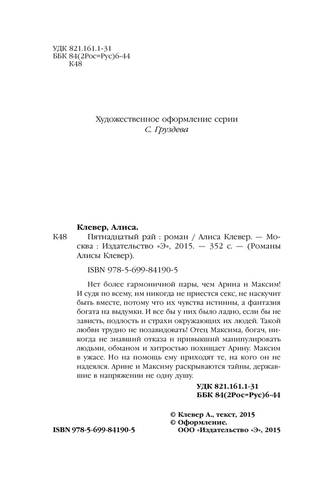 Пятнадцатый райВ данный момент этот товар отсутствует в продаже. Возможно, у нас найдется аналогичный или похожий товар здесь. Серия: Русская Эрика Джеймс. Романы Алисы Клевер Нет более гармоничной пары, чем Арина и Максим! И судя по всему, им никогда не приестся секс, не наскучит быть вместе, потому что их чувства истинны, а фантазия богата на выдумки. И все бы у них было ладно, если бы не зависть, подлость и страхи окружающих их людей. Такой любви трудно не позавидовать! |
