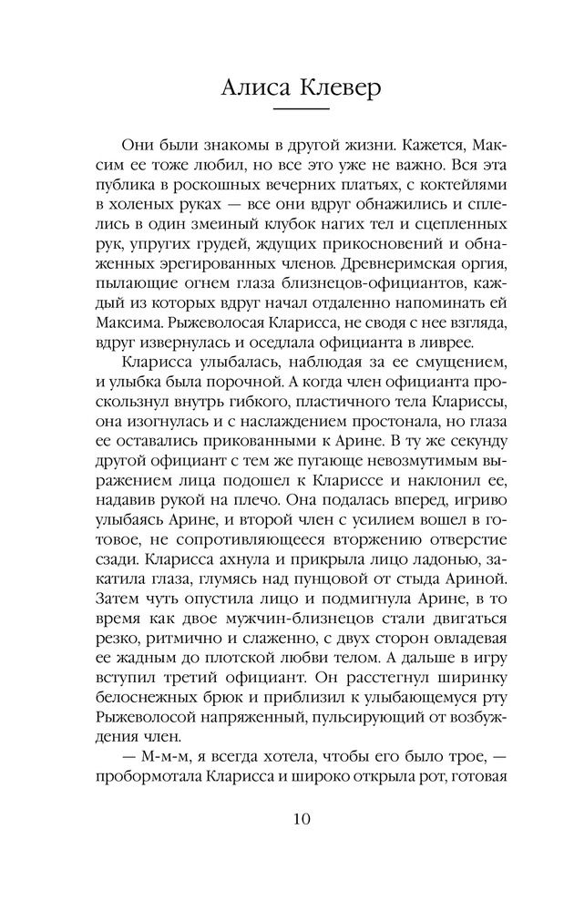 | Алиса Клевер — российский писатель, автор трилогии «Два месяца и три дня» — русского ответа «50 оттенкам серого». Алиса Клевер — это псевдоним, за которым скрывается популярный автор, книги которого читает вся страна. По словам писателя, откровенная чувственная трилогия — это смелый эксперимент. «Для писателей табу всегда становится вызовом. Так что работа над трилогией стала для меня своего рода попыткой заглянуть внутрь неуправляемой стихии, урагана — и описать все так, как вижу я», —... |