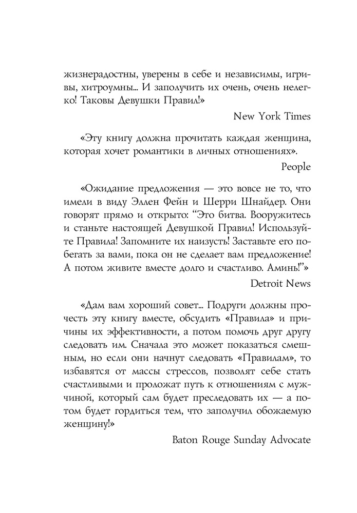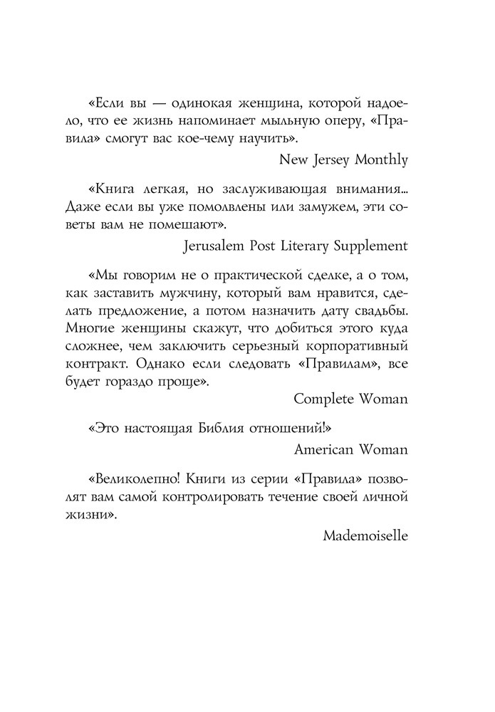 Книжку советую всем свободным и незамужним женщинам, как и другие книги этих авторов. Книга рассказывает о том, как отношения строятся в реальной жизни. Хорошо показана роль настоящей женщины, той, у которой преобладает женская энергия, которая в этой жизни хочет идти рука об руку с мужчиной и хочет семью и именно строить отношения с любимым и любящим мужчиной в семье. Книга показывает как женщине сохранить достоинство и не превратиться в крикливую истеричку, которая вечно пилит мужа.