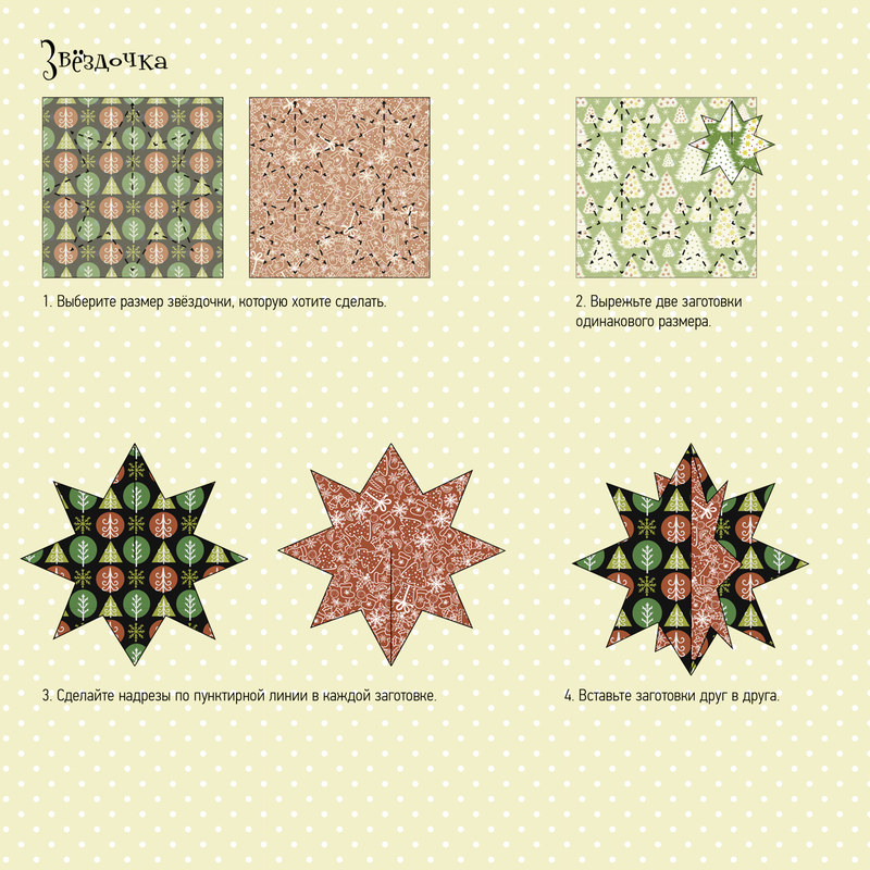 Набор бумаги отличный, на каждой странице пунктиром нанесены контуры по которым нужно вырезать и собрать игрушку или гирлянду. Бумага чуть плотнее офисной (А4) правда, звезды форму не держат, для них нужна бумага поплотнее.