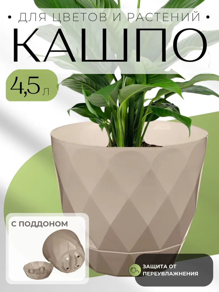 Homver Горшок для цветов с поддоном «Laurel»В данный момент этот товар отсутствует в продаже. Возможно, у нас найдется аналогичный или похожий товар здесь. Серия: Laurel Горшок линейки «Laurel» объёмом 4.5 л и диаметром 22 см снабжён поддоном и системой прикорневого полива. Стильная, минималистичная рельефная фактура, напоминающая огранку драгоценного камня, и спокойный базовый цвет помогут гармонично вписать горшок в домашний интерьер. Горшок оптимален для подросших и крупных растений, состоит из корпуса и интегрированного поддона, не выступающего за дно горшка. Корпус имеет несколько дренажных отверстий, обеспечивающих качественную вентиляцию корней растений. Каждый поддон снабжён специальной выемкой для слива лишней жидкости, который рекомендуется при уходе за любыми цветами. Изделия производятся из долговечного, на 100% перерабатываемого полипропилена. |