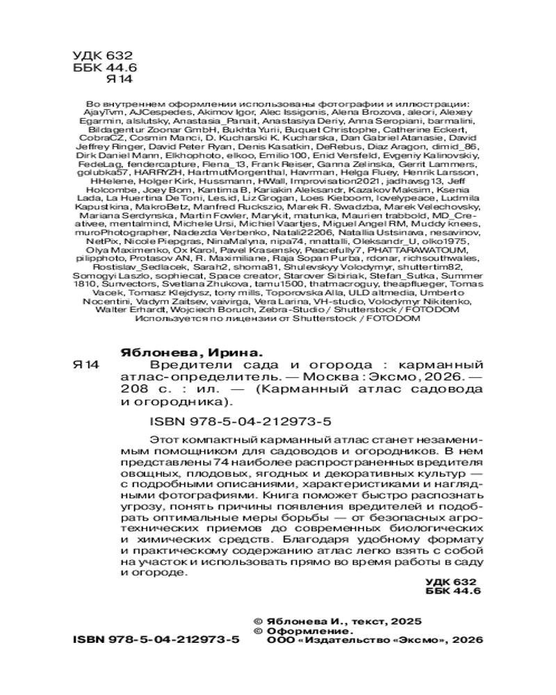 💳 Оплатить за товар можно при получении 🇰🇿 Есть бесплатная доставка по Казахстану от 1 дня 🎁 Копите бонусы с каждой покупки Серия: Карманный атлас садовода и огородника Каждый садовод сталкивался с неприятной ситуацией — еще вчера растения выглядели здоровыми, а сегодня листья в дырах, завязи опадают, урожай погибает. Вредители действуют быстро и скрытно, и без своевременной реакции можно потерять весь сезонный труд. С этим атласом-определителем вы научитесь определять вредителей сада и огорода, способных лишить вас урожая и загубить растения. Здесь вы найдете подробные описания, характеристики и фотографии 74 видов вредителей овощных, плодовых, ягодных культур и декоративных растений, и, что самое главное — советы по эффективной борьбе с ними. |
