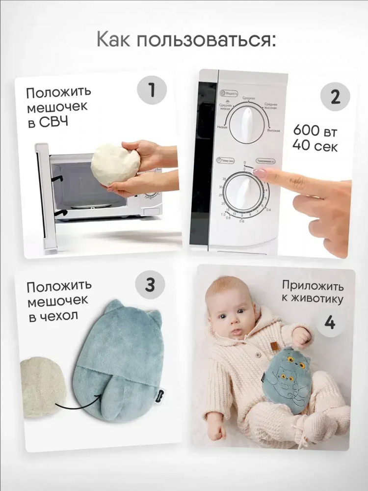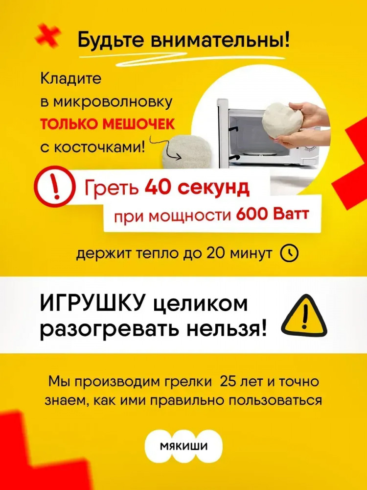 Внутри грелки находится льняной мешочек с натуральными вишнёвыми косточками, который делает игрушку многофункциональной. Нагревайте мешочек в микроволновой печи в течение 40 секунд, чтобы получить тёплую грелку, которая: