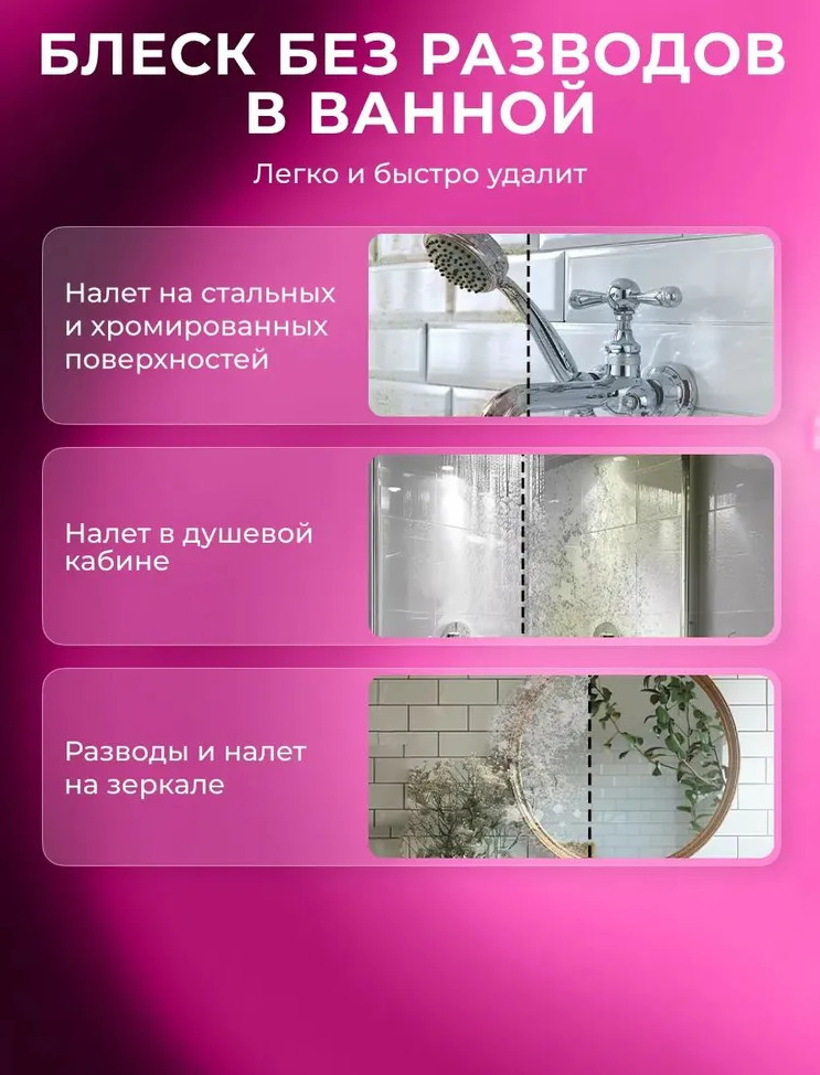 Благодаря этому, вы можете быть уверены, что она подходит для ванной, мытья стекол, плиты, душевых кабин, она также поможет избавиться от налета в ванной, все предметы будут сохранены в идеальном состоянии. Наша бытовая химия легко и равномерно наносится на поверхность, а затем легко смывается водой, не оставляя следов и разводов. Она экономична в использовании, так как даже небольшое количество средства обеспечивает максимальный эффект. |