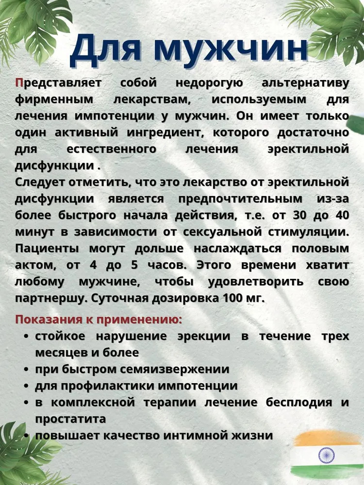 Гель в стиках для мужчин представляет собой недорогую альтернативу фирменным лекарствам, используемым для лечения импотенции у мужчин.Он имеет только один активный ингредиент которого достаточно для естественного лечения эректильной дисфункции. Следует отметить, что это лекарство от эректильной дисфункции является предпочтительным из-за более быстрого начала действия, т. е. от 30 до 40 минут в зависимости от сексуальной стимуляции. Пациенты могут дольше наслаждаться половым актом, от 4 до 5 часов. Этого времени хватит любому мужчине, чтобы удовлетворить свою партнершу. Суточная дозировка 100 мг.