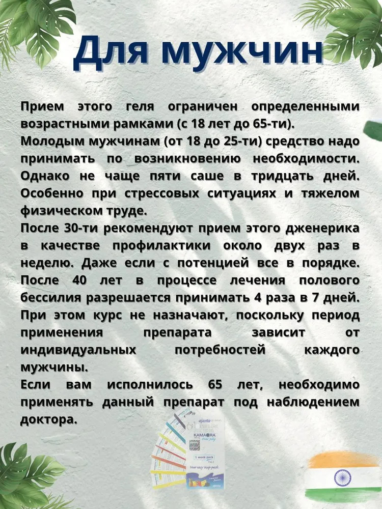 Способ применения: прием этого геля ограничен определенными возрастными рамками (с 18 лет до 65-ти). Молодым мужчинам (от 18 до 25-ти) средство надо принимать по возникновению необходимости. Однако не чаще пяти саше в тридцать дней. Особенно при стрессовых ситуациях и тяжелом физическом труде. После 30-ти рекомендуют прием этого дженерика в качестве профилактики около двух раз в неделю. Даже если с потенцией все в порядке. После 40 лет в процессе лечения полового бессилия разрешается принимать «Камагру» 4 раза в 7 дней. При этом курс не назначают, поскольку период применения препарата зависит от индивидуальных потребностей каждого мужчины. Если вам исполнилось 65 лет, необходимо применять данный препарат под наблюдением доктора.