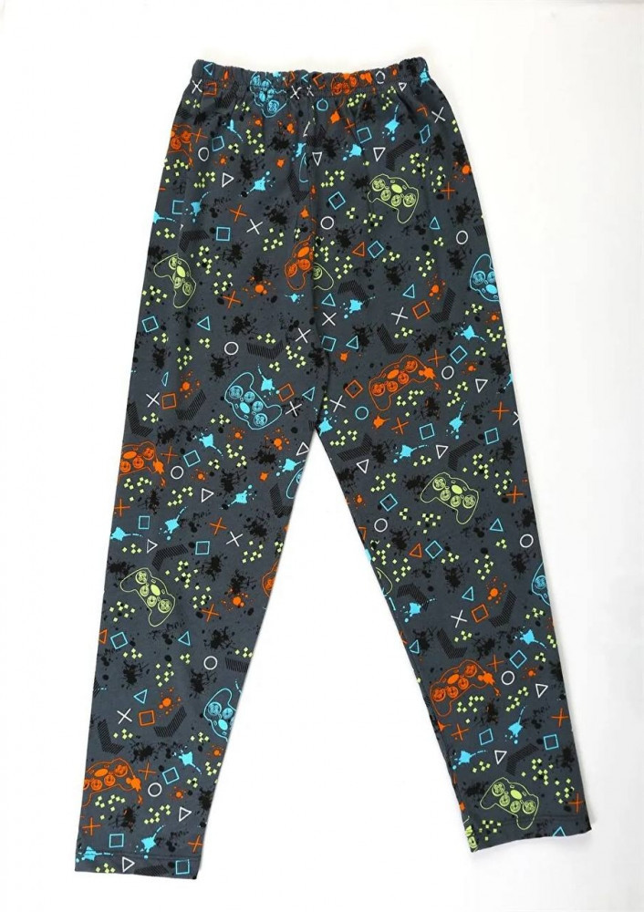 Этот удобный комплект домашней одежды или пижамы включает в себя футболку с короткими рукавами и круглым вырезом. На груди футболки расположен яркий принт с изображением игрового контроллера и мотивирующими надписями «NEVER GIVE UP» и «DARE TO START». Длинные брюки свободного кроя и эластичным поясом украшены сплошным узором из разноцветных символов и значков игровых консолей. Комплект, как правило, изготовлен из хлопка или смесовых тканей, что обеспечивает комфорт и воздухопроницаемость.