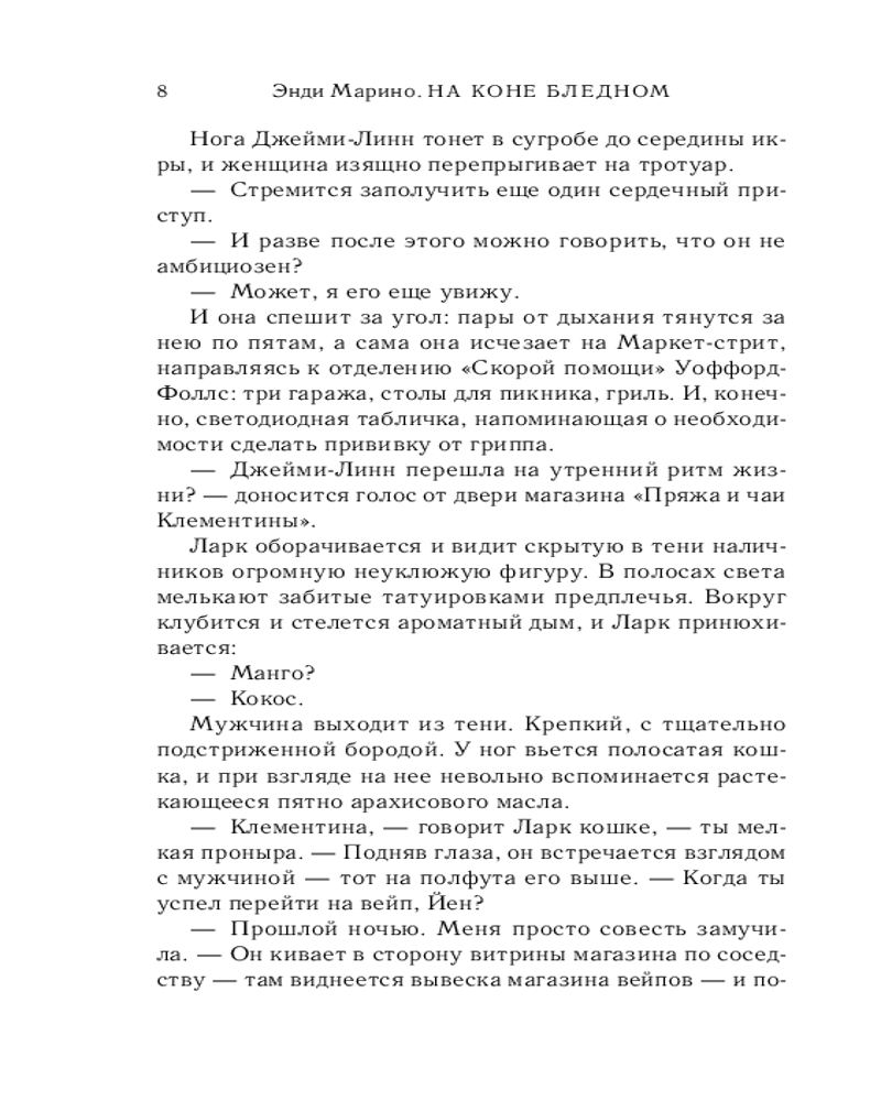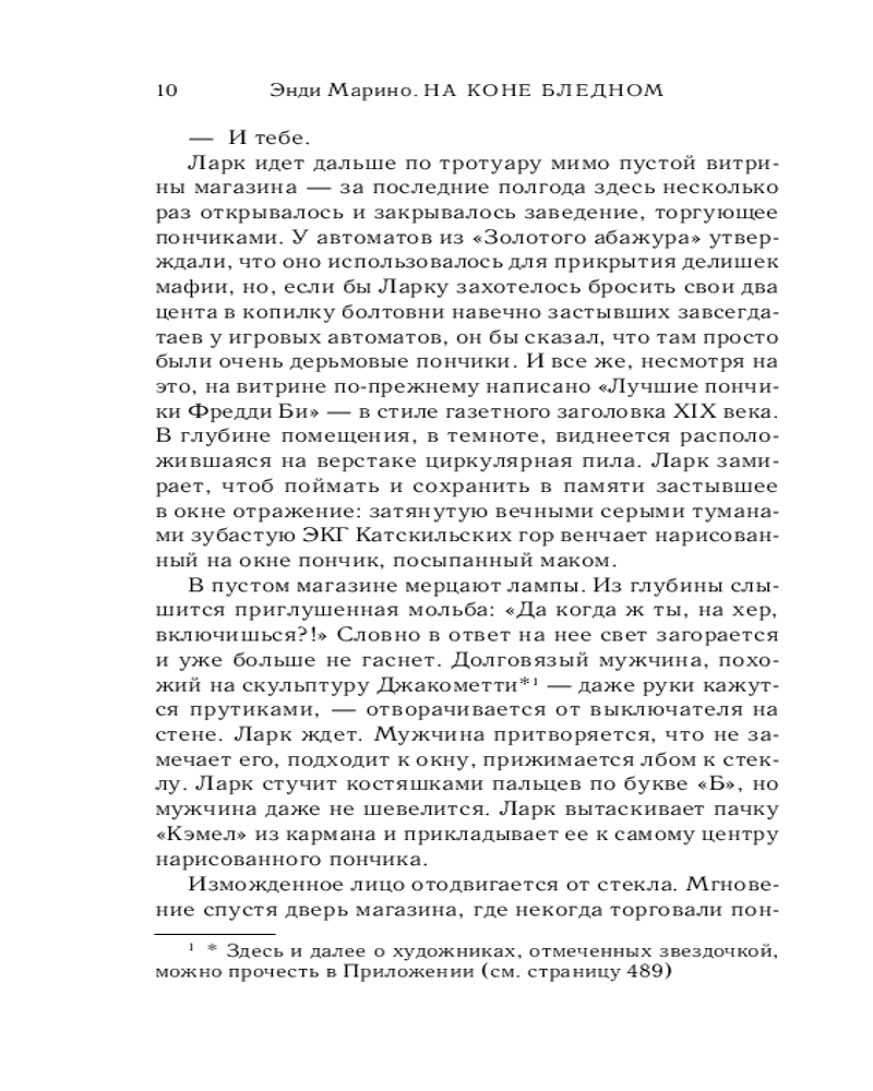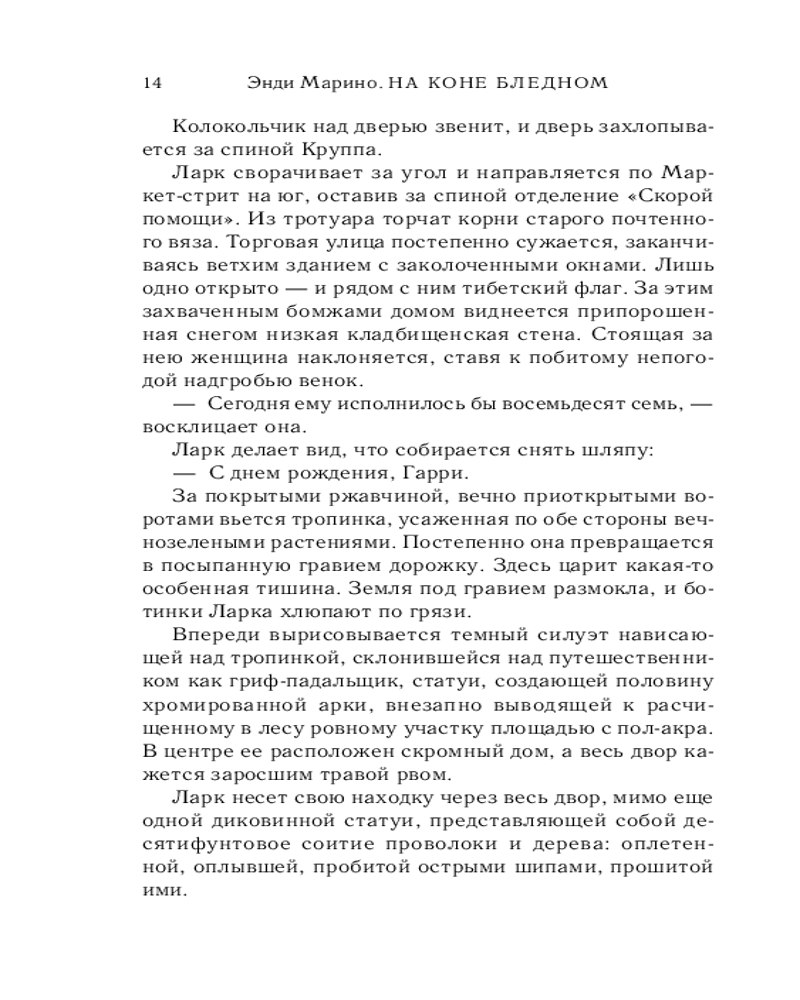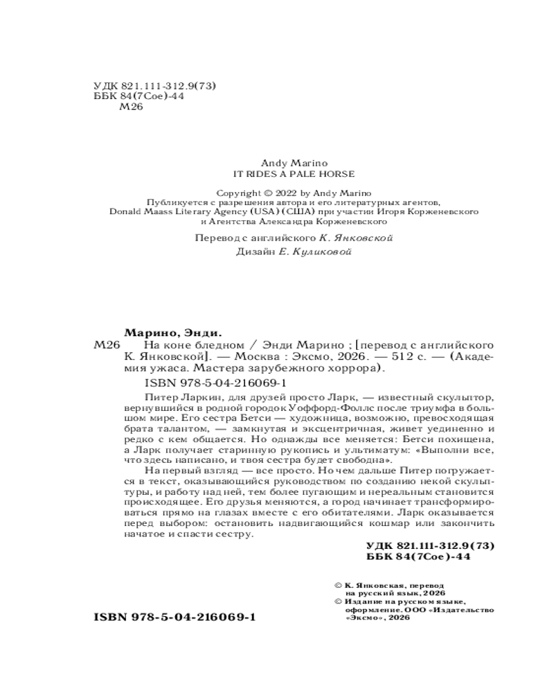 💳 Оплатить за товар можно при получении 🇰🇿 Есть бесплатная доставка по Казахстану от 1 дня 🎁 Копите бонусы с каждой покупки Серия: Fanzon. Академия ужаса. Мастера зарубежного хоррора Скульптор-авангардист Питер Ларкин — для друзей просто Ларк — местная знаменитость в тихом городке Уоффорд-Фоллс и душа любой компании. Добившись признания в большом мире, он возвращается домой, к любимой сестре. Бетси тоже одарена. И эксцентрична. И в отличие от брата предпочитает держаться особняком. Когда Ларк приезжает на встречу с баснословно богатым клиентом, всё кажется вполне обыденным. Даже мрачный охранник у ворот огромного уединенного поместья не вызывает подозрений. Пока тот не включает ему видео: в реальном времени Ларк видит, как кто-то похищает Бетси. Ему говорят, что с сестрой пока всё в порядке, но ее жизнь теперь зависит от него. А потом вручают старую рукописную книгу со словами: «Следуй ее указаниям — и Бетси будет свободна. Главное — не останавливайся. Даже если придется пожертвовать всеми жителями города». |