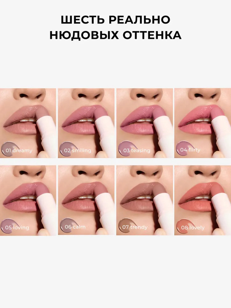 Приятная в нанесении и на губах в целом, оттенок 02. Не сильно виден на губах, идеальный нюд