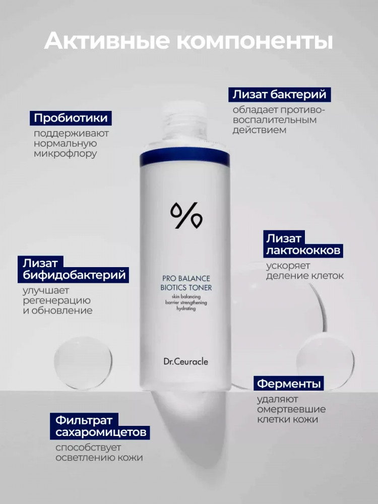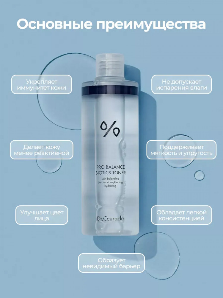 Тоник с комплексом пробиотиков для чувствительной кожи Dr.Ceuracle Pro Balance Biotics Toner в короткие сроки устраняет сухость и стянутость кожи, активно насыщает клетки влагой, восстанавливает естественный гидролипидный баланс. Успокаивает раздраженную кожу, устраняет покраснения и воспаления, выравнивает тон.Тоник укрепляет иммунитет кожи, делает ее менее реактивной, повышает защитные функции. Образует невидимый барьер, не допускающий испарения влаги и оберегающий кожу от губительного воздействия ультрафиолета, свободных радикалов и других факторов окружающей среды. Поддерживает мягкость и упругость кожи, улучшает цвет лица.