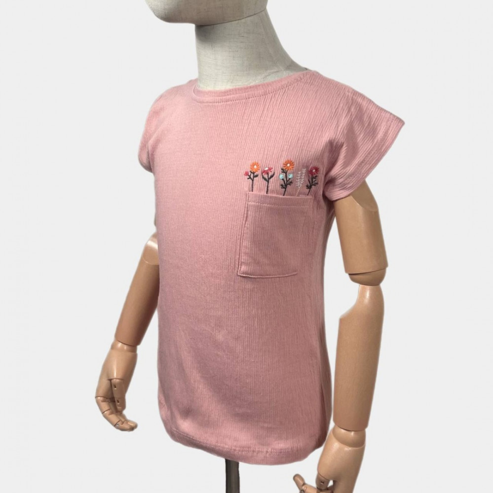 Детская футболка свободного кроя из мягкой и лёгкой ткани с фактурной поверхностью. Модель с круглым вырезом и короткими рукавами обеспечивает комфорт в повседневной носке. Спереди расположен аккуратный накладной карман с нежной вышивкой, добавляющей образу милый акцент. Футболка хорошо пропускает воздух, не сковывает движений и подходит для прогулок, детского сада и активного отдыха.