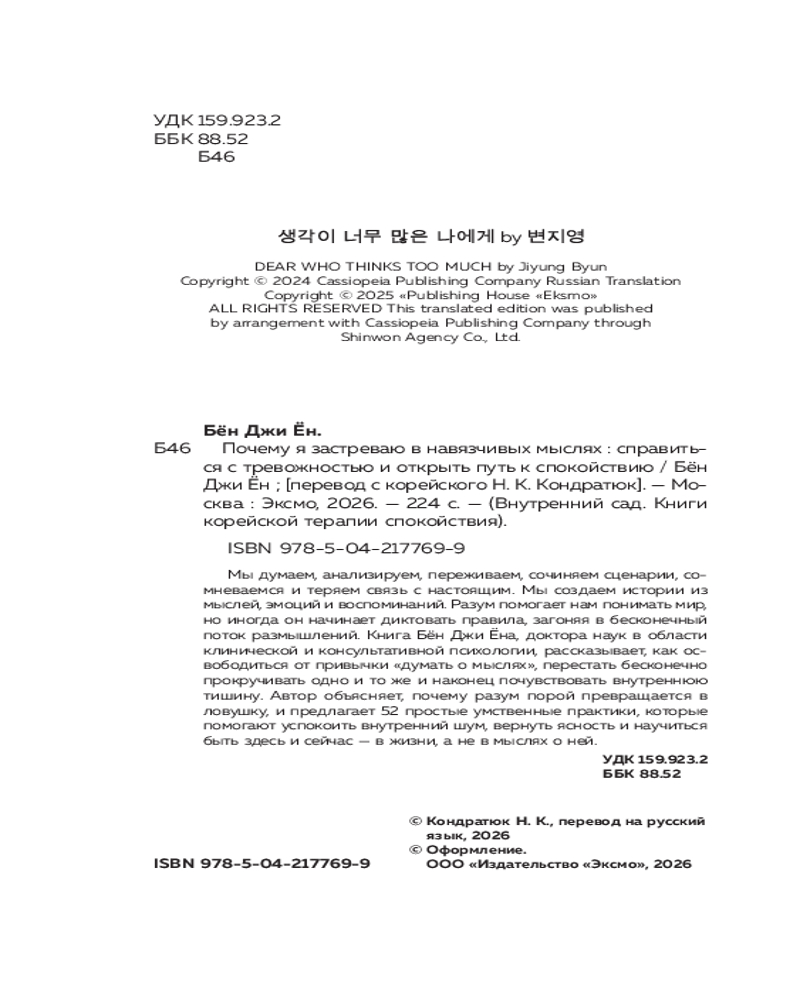 💳 Оплатить за товар можно при получении 🇰🇿 Есть бесплатная доставка по Казахстану от 1 дня 🎁 Копите бонусы с каждой покупки Серия: Внутренний сад. Книги корейской терапии спокойствия «Почему я переживаю о том, что думают другие?», «Почему мне сложно переключиться на что-то хорошее, когда я злюсь или обижен?»... Многие из нас застревают в бесконечном потоке размышлений. Кажется, что если всё обдумать, то станет легче. Но чем больше мы анализируем, тем сильнее тревожимся — и тем крепче становимся пленниками собственных мыслей. |