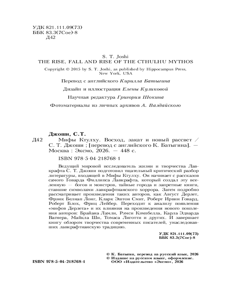 💳 Оплатить за товар можно при получении 🇰🇿 Есть бесплатная доставка по Казахстану от 1 дня 🎁 Копите бонусы с каждой покупки Серия: Fanzon. Лавкрафт. Подарочное издание От автора фундаментального исследования «Лавкрафт. Я — Провиденс»! Кто на самом деле создал «Мифы Ктулху»? Чем «Мифы Лавкрафта» отличаются от того, что мы привыкли видеть у его последователей? И почему эта вселенная снова и снова завораживает миллионы читателей по всему миру? Главный эксперт по жизни и творчеству Лавкрафта, С. Т. Джоши, раскрывает тайную историю самого мрачного и влиятельного мифа XX века. От восхода до заката, от искажённых толкований до триумфального нового рассвета — перед вами книга, которая перевернёт ваше представление о «Мифах Ктулху». Если вы хотите понять не только ужас в литературе, но и то, как рождаются и выживают культурные мифы, — эта книга станет вашим проводником в бездну. |