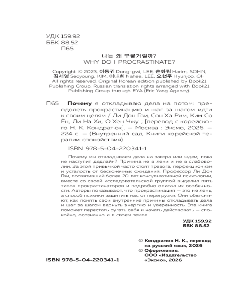 💳 Оплатить за товар можно при получении 🇰🇿 Есть бесплатная доставка по Казахстану от 1 дня 🎁 Копите бонусы с каждой покупки Серия: Внутренний сад. Книги корейской терапии спокойствия Мысль «Я должен это сделать» и оправдание «Я сделаю это позже» часто звучат дуэтом в наших головах. Отложить дела на потом кажется слабостью, но на самом деле прокрастинация — это способ психики защитить нас от тревоги, перфекционизма и усталости. Авторы книги, профессор Ли Донгви, посвятивший более 20 лет консультативной психологии, вместе со своей исследовательской группой объяснили, почему мы откладываем дела на потом и как мягко вернуть себе желание действовать. Они поделились результатами многолетних трудов, историями из жизни и простыми инструментами, которые помогают перестать ругать себя и начать действовать — спокойно, осознанно и в своем темпе. |