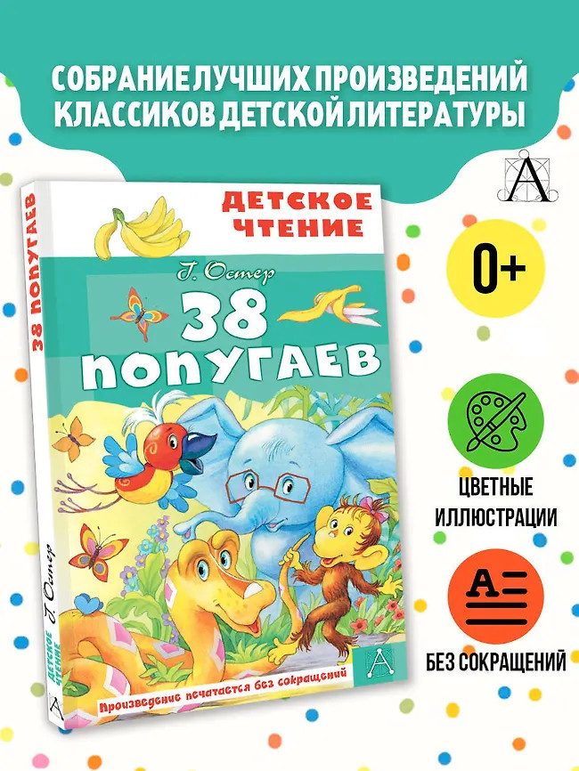 💳 Оплатить за товар можно при получении 🇰🇿 Есть бесплатная доставка по Казахстану от 1 дня 🎁 Копите бонусы с каждой покупки Серия: Детское чтение Григорий Остер в 1975 году написал первые сказочные истории про четырёх животных из Африки и назвал цикл «38 попугаев». А уже через год вышла первая серия одноимённого кукольного мультфильма, ставшего классикой детской мультипликации. Сказки Остера также стали культовыми — добрые и смешные истории про попугая, мартышку, удава и слонёнка до сих пор влюбляют в себя детей. В наш сборник вошли истории «Будем знакомы», «Зарядка для хвоста», «Привет мартышке» и другие. |