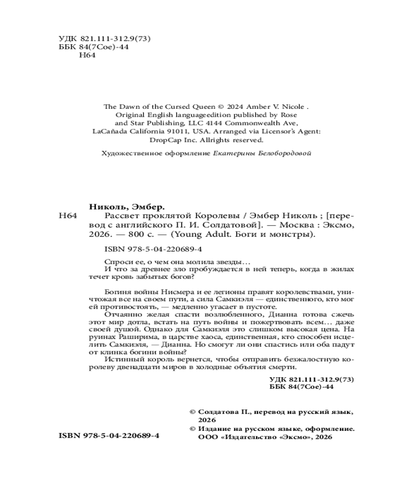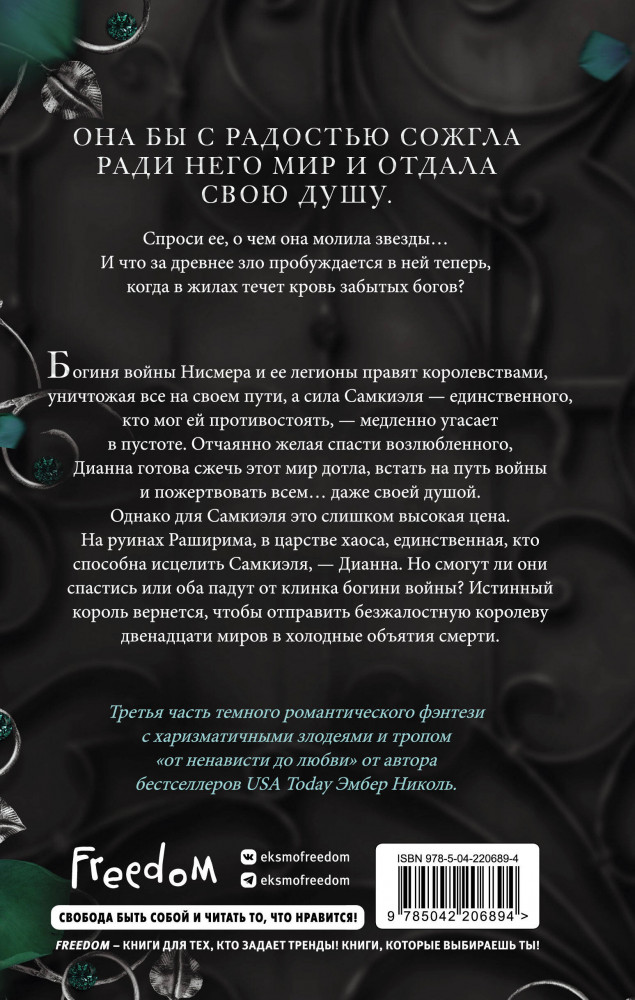 💳 Оплатить за товар можно при получении 🇰🇿 Есть бесплатная доставка по Казахстану от 1 дня 🎁 Копите бонусы с каждой покупки Серия: Young Adult. Боги и монстры Дианна, в чьих жилах течет древняя кровь, готова на всё, чтобы спасти единственного истинного короля. Но за его воскрешение девушке придется дорого заплатить. Богиня войны Нисмера и ее легионы правят королевствами, уничтожая всё на своем пути, а сила Самкиэля — единственного, кто мог ей противостоять, — медленно угасает в пустоте. Отчаянно желая спасти возлюбленного, Дианна готова сжечь этот мир дотла, встать на путь войны и пожертвовать всем... даже своей душой. Однако для Самкиэля это слишком высокая цена. На руинах Раширима, в царстве хаоса, единственная, кто способна исцелить Самкиэля — Дианна. Но смогут ли они спастись или оба падут от клинка Богини Войны? Истинный король вернется, чтобы отправить безжалостную королеву двенадцати миров в холодные объятия смерти. |