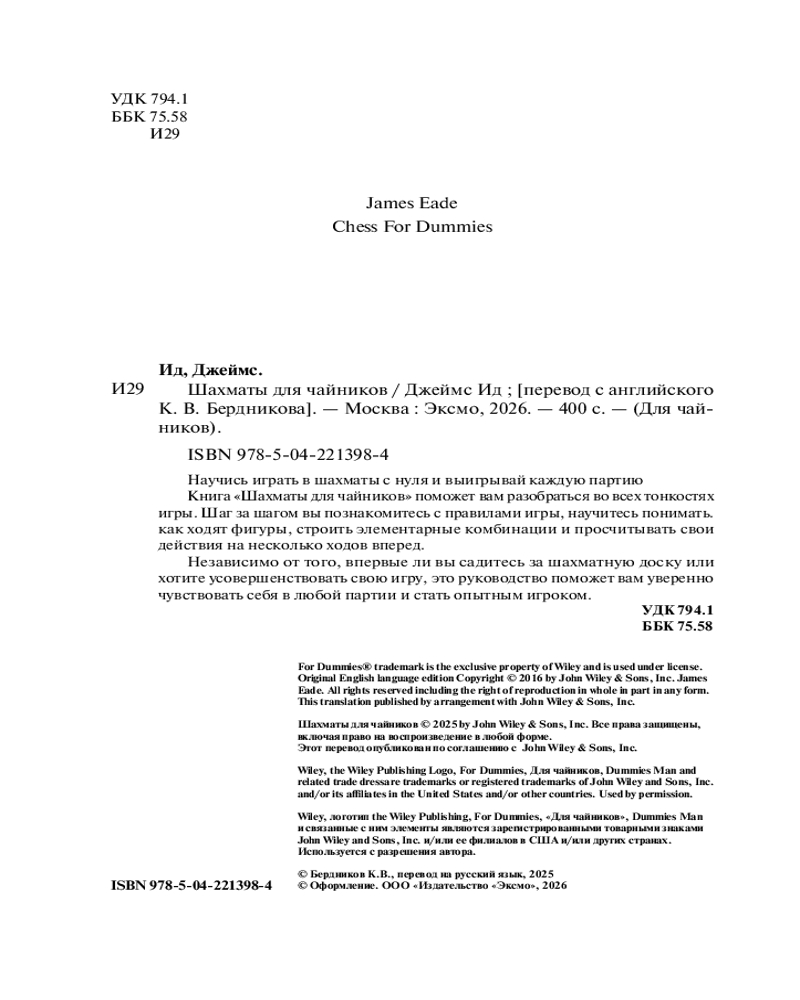 💳 Оплатить за товар можно при получении 🇰🇿 Есть бесплатная доставка по Казахстану от 1 дня 🎁 Копите бонусы с каждой покупки Серия: Для чайников Научись играть в шахматы с нуля и выигрывай каждую партию. Шахматы снова становятся популярными — о них снимают сериалы, играют онлайн и на мобильных устройствах. Но как начать, если правила кажутся сложными, а фигур столько, что легко запутаться? Книга «Шахматы для чайников» поможет вам разобраться во всех тонкостях игры. Шаг за шагом вы познакомитесь с правилами игры, научитесь понимать, как ходят фигуры, строить элементарные комбинации и просчитывать свои действия на несколько ходов вперед. Независимо от того, впервые ли вы садитесь за шахматную доску или хотите усовершенствовать свою игру, это руководство поможет вам уверенно чувствовать себя в любой партии и стать опытным игроком. |