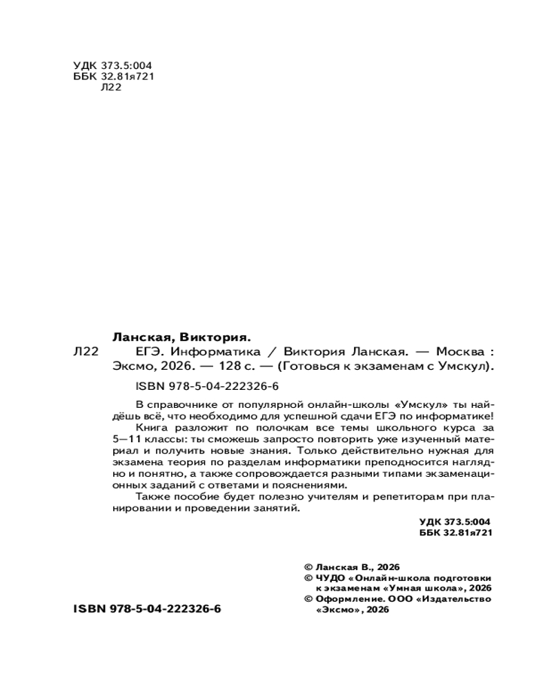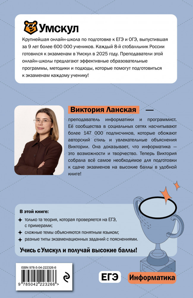 💳 Оплатить за товар можно при получении 🇰🇿 Есть бесплатная доставка по Казахстану от 1 дня 🎁 Копите бонусы с каждой покупки Серия: Готовься к экзаменам с Умскул Эксклюзивный справочник от издательства «Эксмо» и топовой онлайн-школы «Умскул», выпустившей за 9 лет более 600 000 учеников, поможет каждому прийти к заветным баллам на ЕГЭ-2026 по информатике. В книжке только самая актуальная и нужная для экзамена теория, а также разбор разных типов заданий! Эта книга разложит по полочкам все темы по предмету за 5, 6, 7, 8, 9, 10, 11 классы: вы сможете запросто повторить уже изученный материал, а также проработать не охваченные ранее вопросы. Информация по разделам преподносится наглядно и понятно, а также сопровождается актуальными примерами. В конце разделов приводятся разные типы экзаменационных заданий с ответами и пояснениями. Так ни одна важная мысль не ускользнёт от вас во время занятий с учебником! Присоединяйся к числу счастливчиков, с лёгкостью преодолевших экзамен благодаря «Умскул»! |