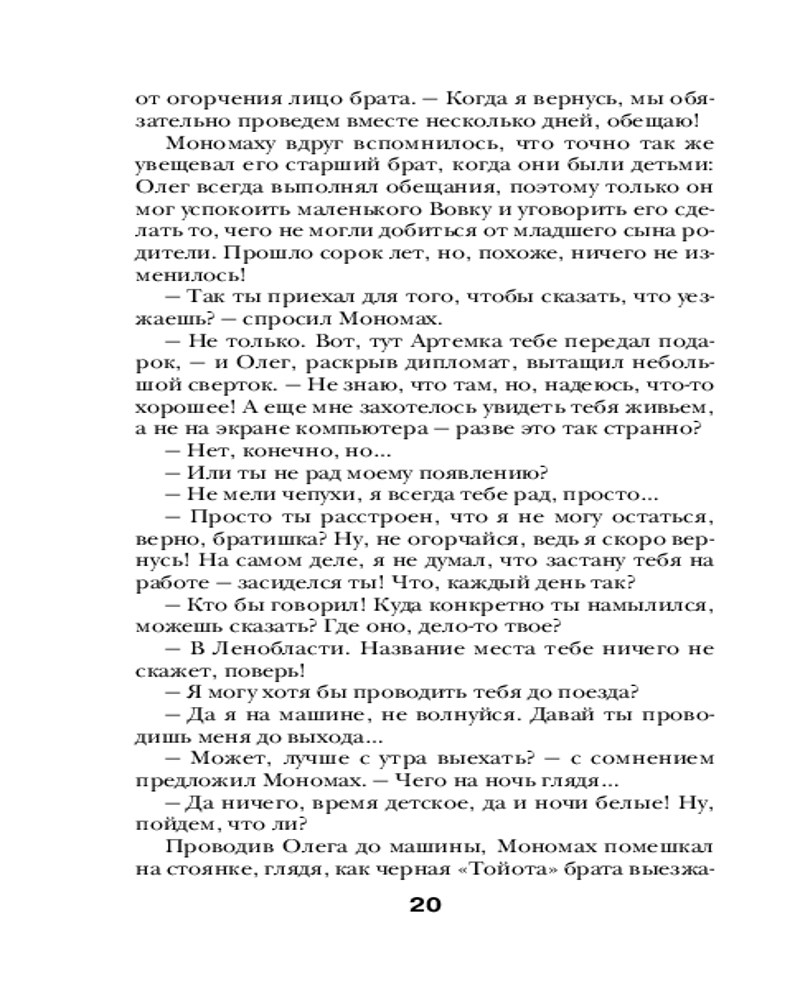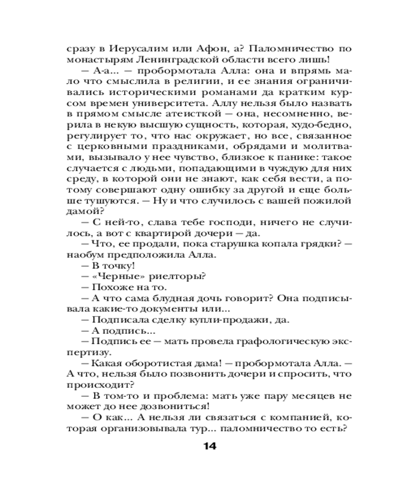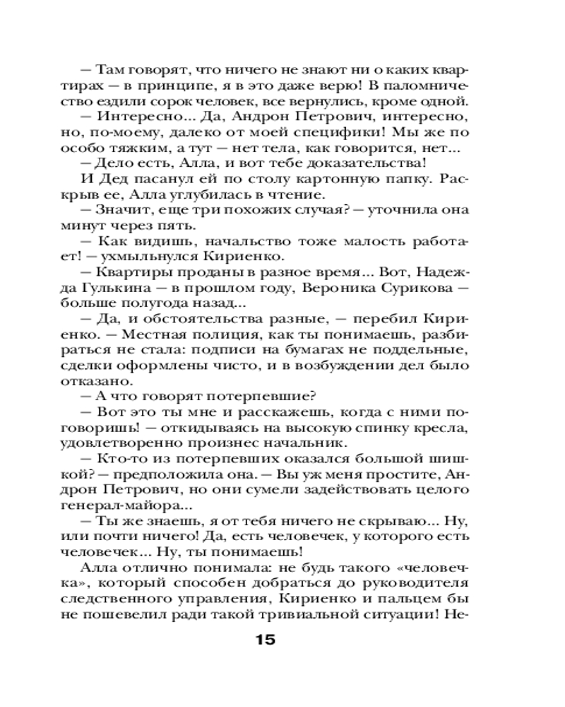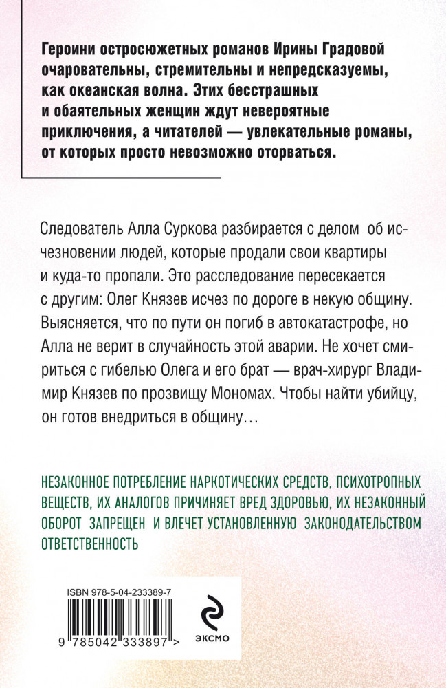 💳 Оплатить за товар можно при получении 🇰🇿 Есть бесплатная доставка по Казахстану от 1 дня 🎁 Копите бонусы с каждой покупки Серия: Кабинетный детектив. Новое оформление (обложка) Следователь Алла Суркова разбирается с делом об исчезновении людей, которые продали свои квартиры и куда-то пропали. Это расследование пересекается с другим: Олег Князев исчез по дороге в некую общину. Выясняется, что по пути он погиб в автокатастрофе, но Алла не верит в случайность этой аварии. Не хочет смириться с гибелью Олега и его брат — врач-хирург Владимир Князев по прозвищу Мономах. Чтобы найти убийцу, он готов внедриться в общину... |