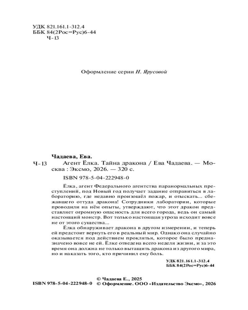 💳 Оплатить за товар можно при получении 🇰🇿 Есть бесплатная доставка по Казахстану от 1 дня 🎁 Копите бонусы с каждой покупки Серия: Премия Русский Детектив (новое оформление) Ёлка, агент Федерального агентства паранормальных преступлений, под Новый год получает задание отправиться в лабораторию, где недавно произошёл пожар, и отыскать... сбежавшего оттуда дракона! Сотрудники лаборатории, которые проводили на нём опыты, утверждают, что этот дракон представляет огромную опасность для всего города, ведь он самый настоящий монстр. Вот только настоящая угроза исходит вовсе не от этого существа... |