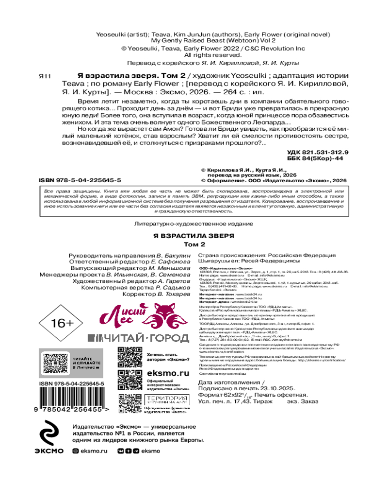 💳 Оплатить за товар можно при получении 🇰🇿 Есть бесплатная доставка по Казахстану от 1 дня 🎁 Копите бонусы с каждой покупки Серия: Кумихо. Хиты корейского фэнтези Время летит незаметно, когда ты коротаешь дни в компании обаятельного говорящего котика... Проходит день за днём — и вот Бриди уже превратилась в прекрасную юную леди! Более того, она вступила в возраст, когда юной принцессе пора обзавестись женихом. И эта тема очень волнует одного Божественного Леопарда... |