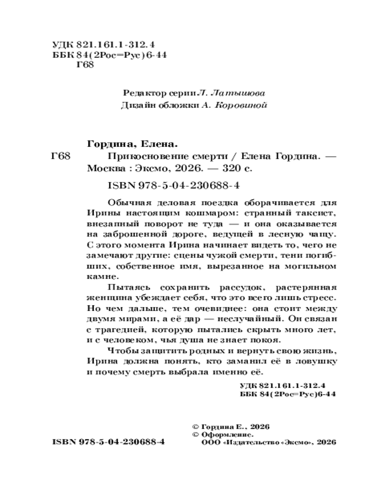💳 Оплатить за товар можно при получении 🇰🇿 Есть бесплатная доставка по Казахстану от 1 дня 🎁 Копите бонусы с каждой покупки Серия: Ловушки судьбы. Детективы Елены Гординой Обычная деловая поездка оборачивается для Ирины настоящим кошмаром: странный таксист, внезапный поворот не туда — и она оказывается на заброшенной дороге, ведущей в лесную чащу. С этого момента Ирина начинает видеть то, чего не замечают другие: сцены чужой смерти, тени погибших, собственное имя, вырезанное на могильном камне. |