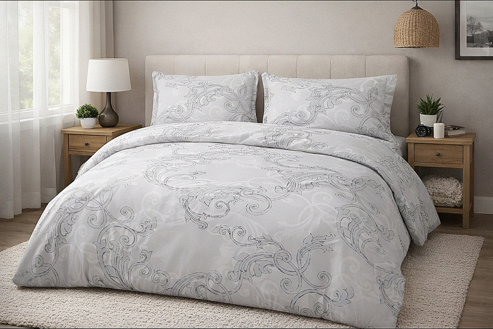 Комплект постельно белья из полисатина сочетает в себе мягкость хлопка и невероятную износостойкость. Изысканный классический узор «дамаск» в приглушенных серых тонах на светлом фоне — это идеальное решение для современного интерьера. Дизайн выглядит дорого, лаконично и успокаивающе.