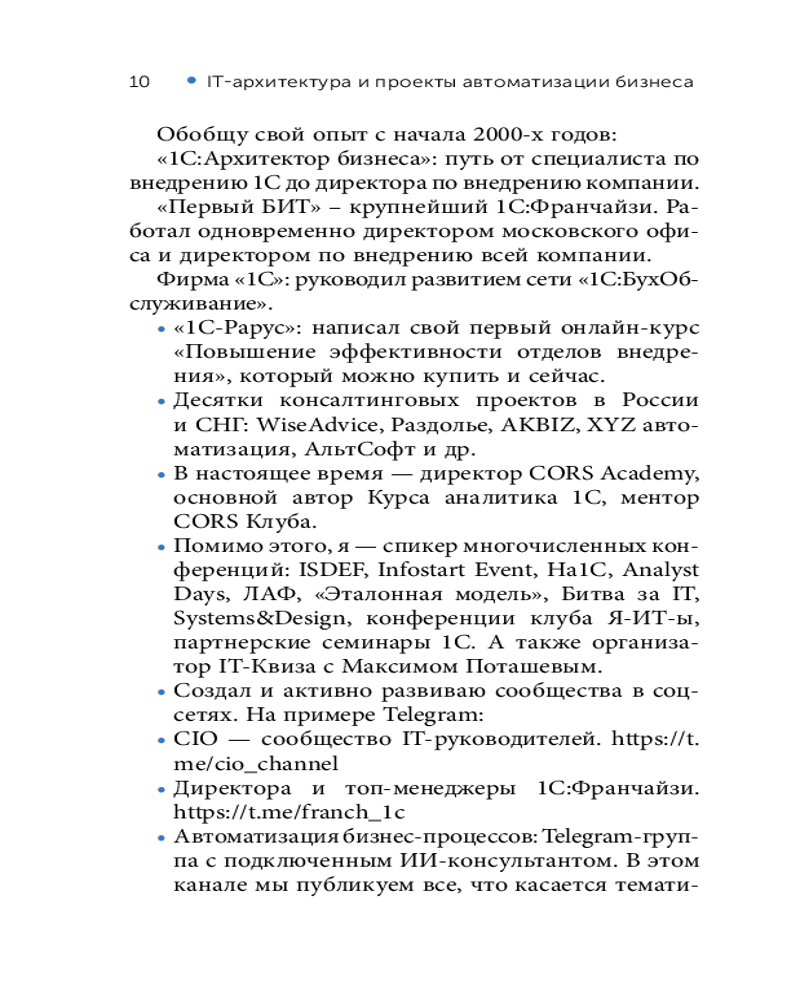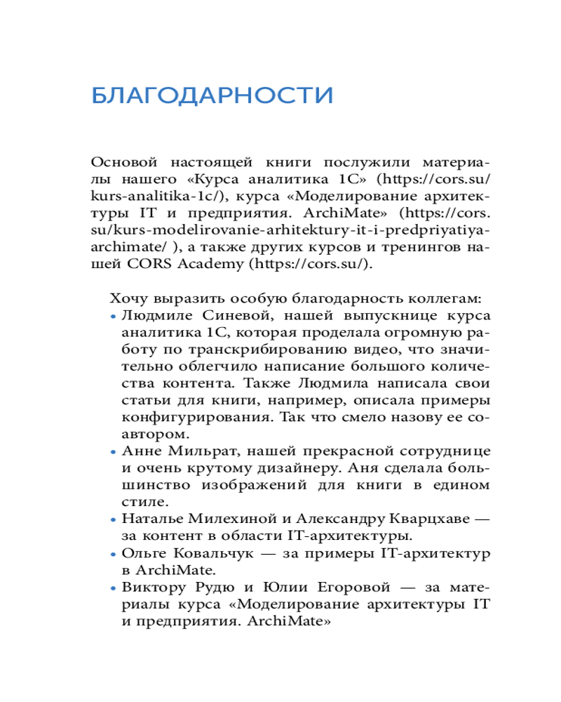 Книга написана на языке практика, каждый раздел построен на реальных проектах, типичных ошибках и решениях, с которыми сталкиваются все, кто внедряет системы. В финале — приглашение в профессиональное сообщество: курсы, тренинги и конференции от CORS Academy, чтобы вы не просто закрыли книгу, а продолжили свой путь в профессии. |