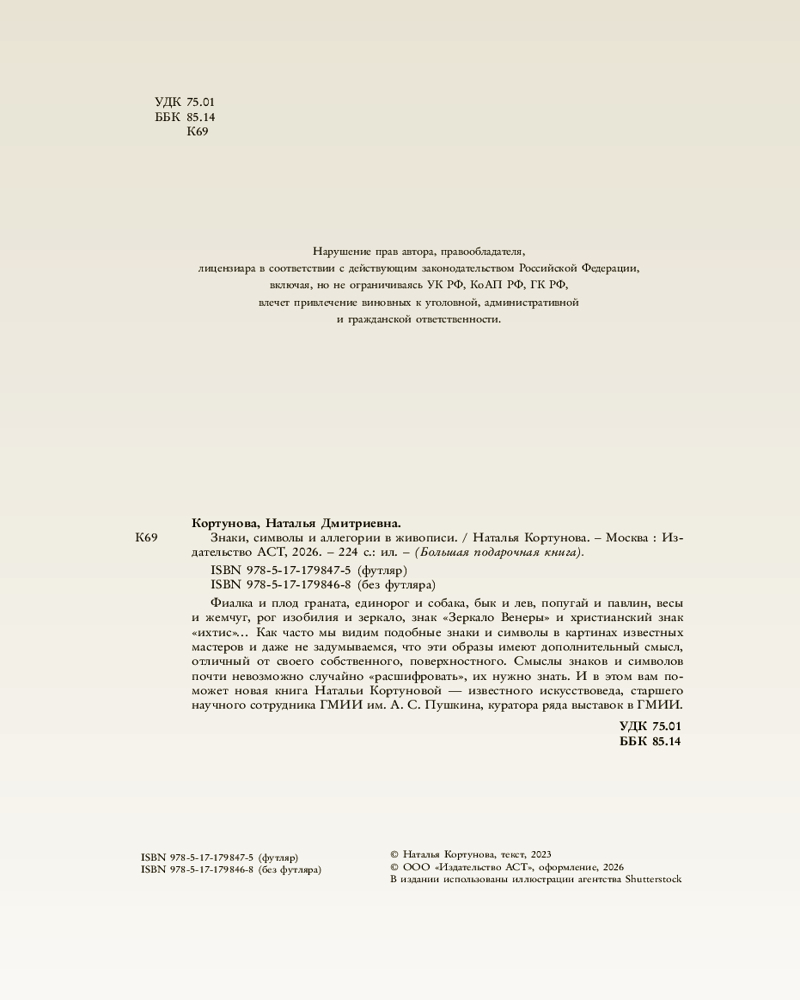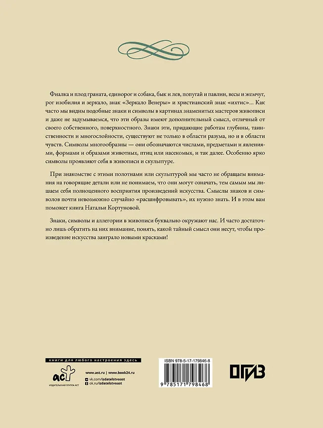 💳 Оплатить за товар можно при получении 🇰🇿 Есть бесплатная доставка по Казахстану от 1 дня 🎁 Копите бонусы с каждой покупки Серия: Большая подарочная книга Фиалка и плод граната, единорог и собака, бык и лев, попугай и павлин, весы и жемчуг, рог изобилия и зеркало, знак «Зеркало Венеры» и христианский знак «ихтис»… Как часто мы видим подобные знаки и символы в картинах известных мастеров и даже не задумываемся, что эти образы имеют дополнительный смысл, отличный от своего собственного, поверхностного. Смыслы знаков и символов почти невозможно случайно «расшифровать», их нужно знать. И в этом вам поможет новая книга Натальи Кортуновой — известного искусствоведа, старшего научного сотрудника ГМИИ им. А. С. Пушкина, куратора ряда выставок в ГМИИ. |