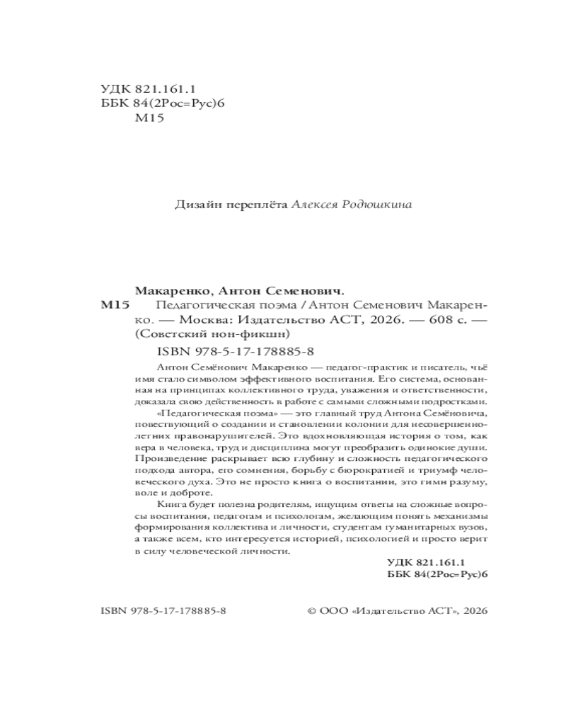 💳 Оплатить за товар можно при получении 🇰🇿 Есть бесплатная доставка по Казахстану от 1 дня 🎁 Копите бонусы с каждой покупки Серия: Советский нон-фикшн «Педагогическая поэма» — это главный труд Антона Семёновича, повествующий о создании и становлении колонии для несовершеннолетних правонарушителей. Это вдохновляющая история о том, как вера в человека, труд и дисциплина могут преобразить одинокие души. Произведение раскрывает всю глубину и сложность педагогического подхода автора, его сомнения, борьбу с бюрократией и триумф человеческого духа. Это не просто книга о воспитании, это гимн разуму, воле и доброте. Книга будет полезна родителям, ищущим ответы на сложные вопросы воспитания, педагогам и психологам, желающим понять механизмы формирования коллектива и личности, студентам гуманитарных вузов, а также всем, кто интересуется историей, психологией и просто верит в силу человеческой личности. |
