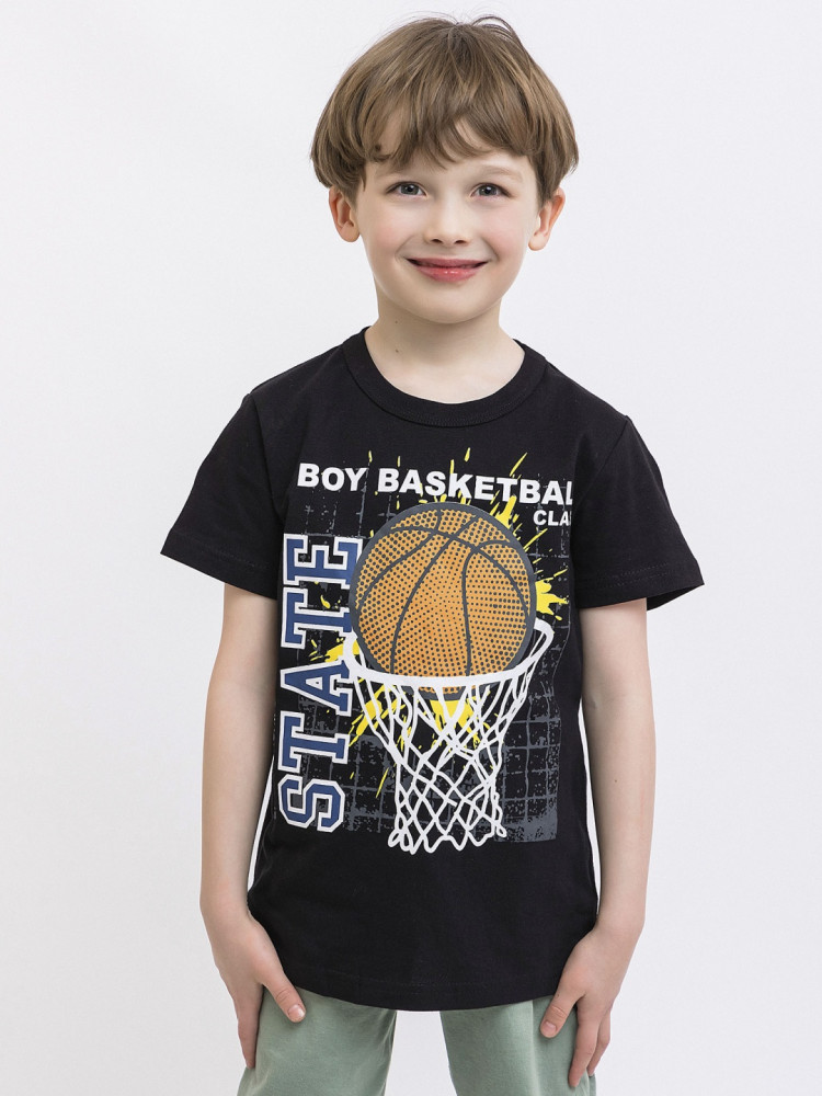 Футболка с коротким рукавом для мальчика из натурального хлопка. Классическая черная расцветка и принт в спортивном стиле. Круглый вырез горловины — удобная посадка, не натирает шею. Футболка идеальна для садика, прогулок и активных игр. Легко комбинируется с любой детской одеждой: брюками, шортами, джинсами.
